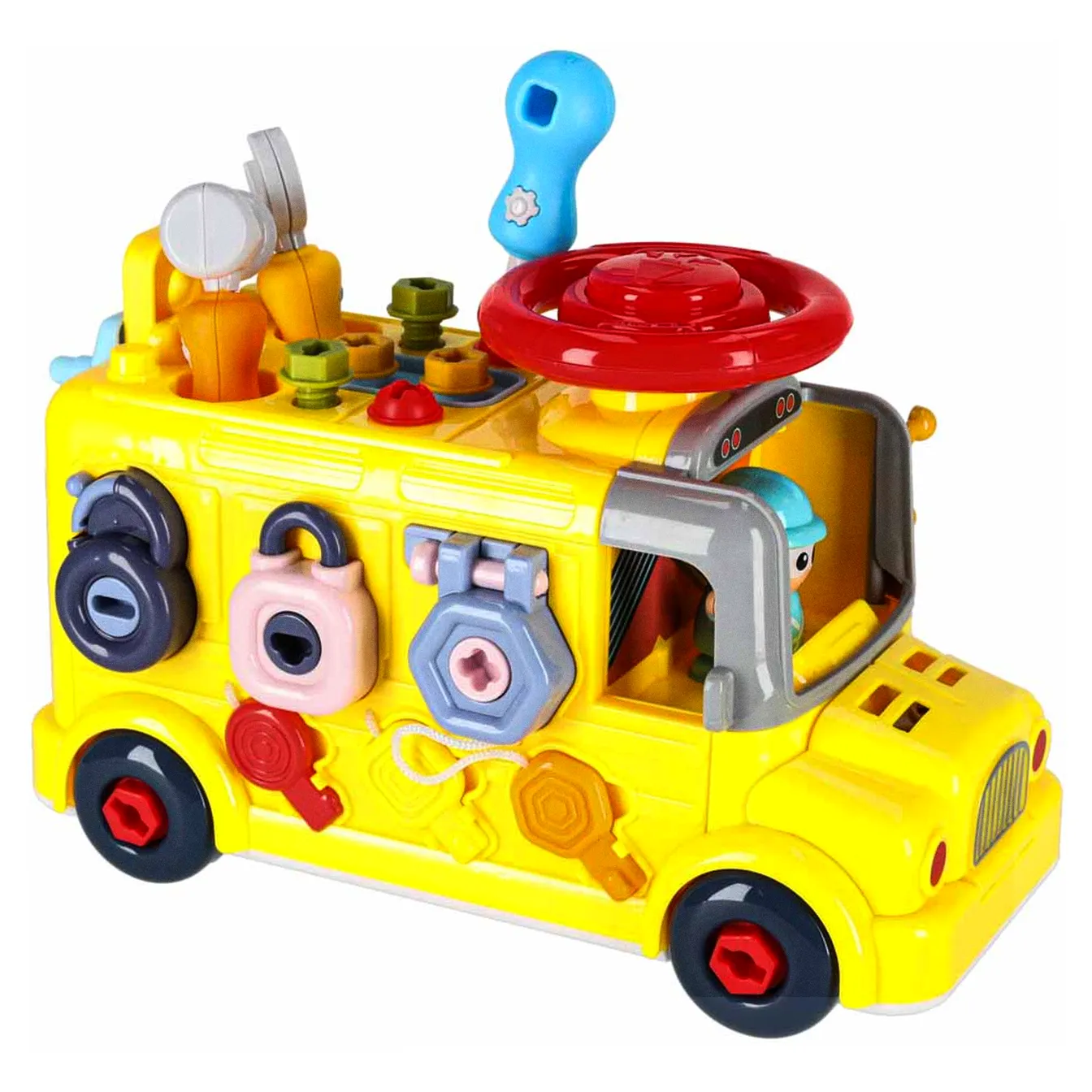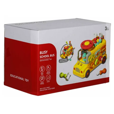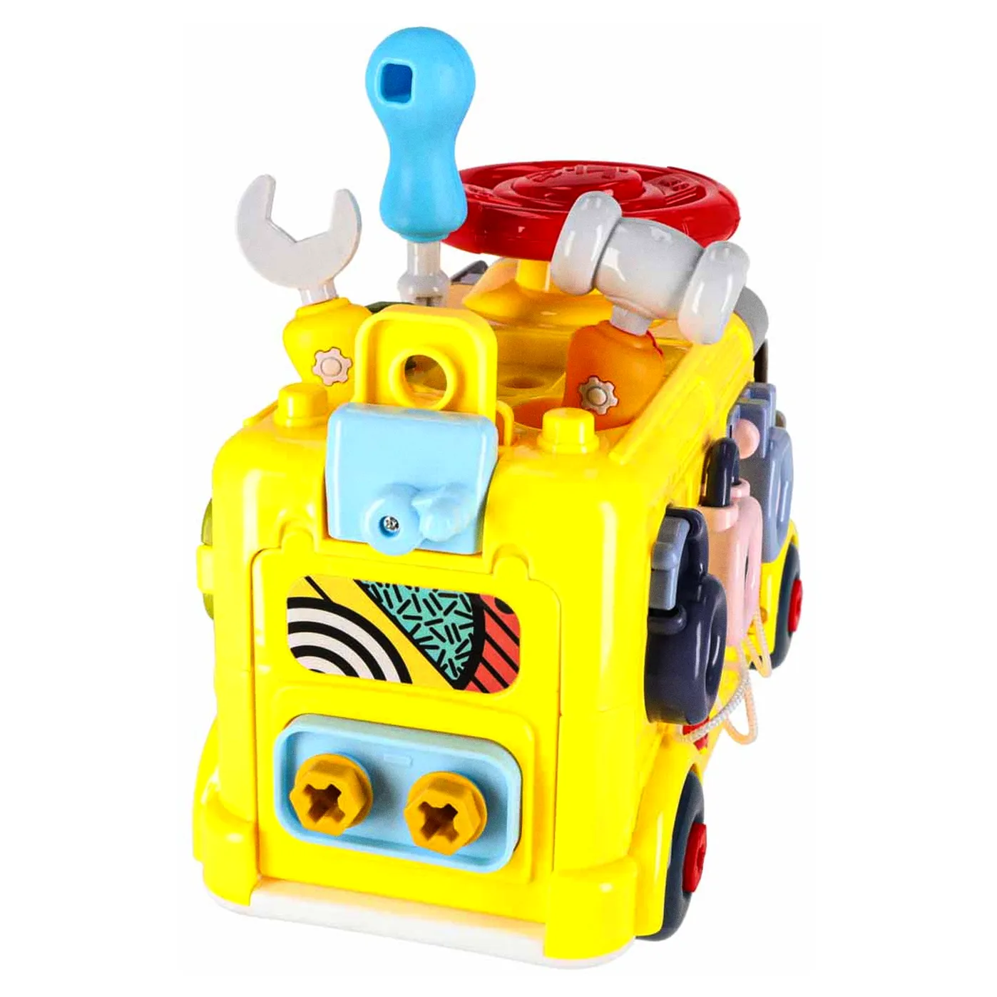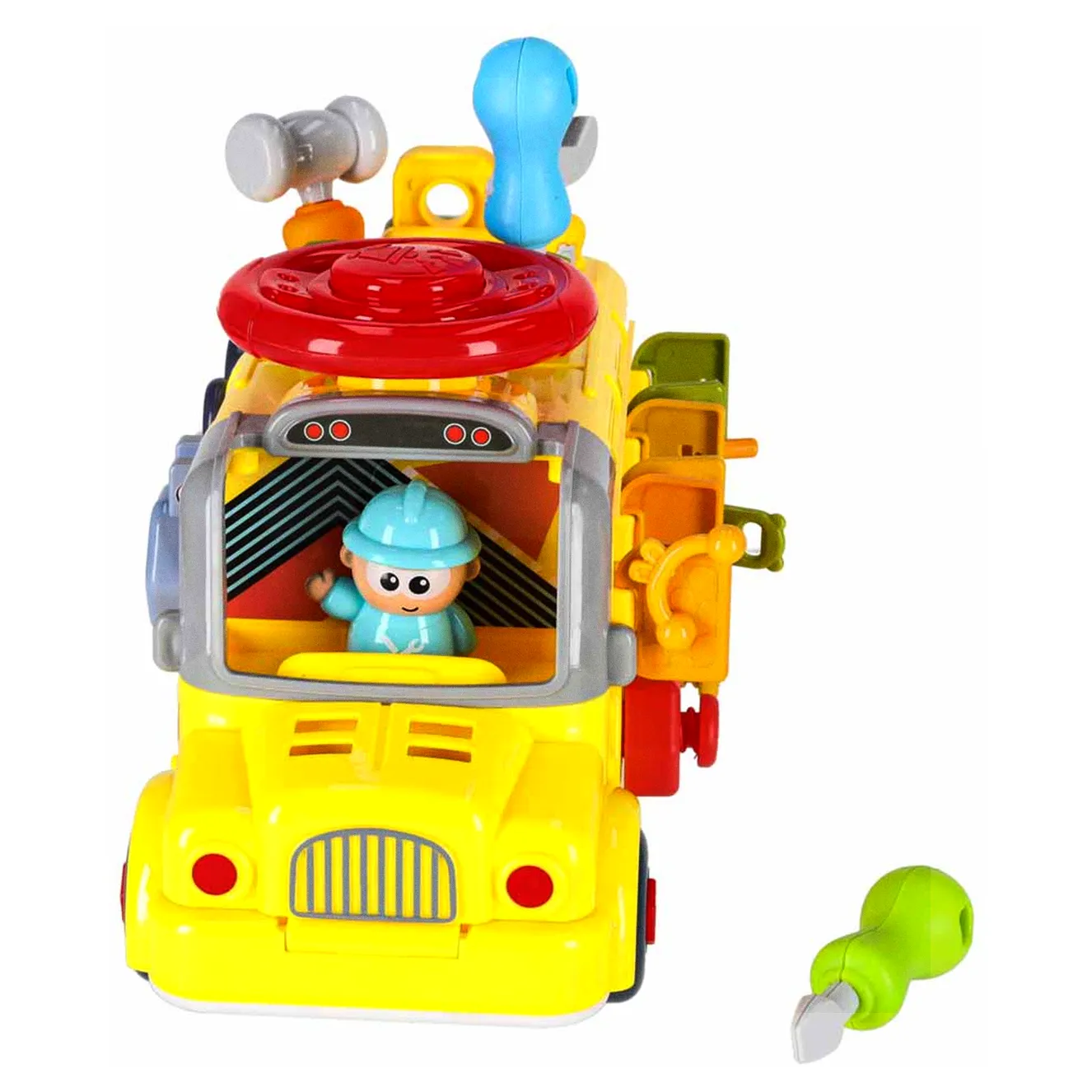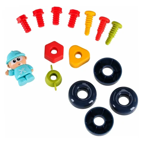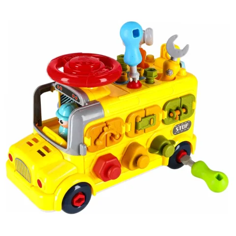 Jeżdżący autobus–auto do majsterkowania oferuje wiele ciekawych funkcji: podnoszoną maskę, otwierane drzwiczki tylne, obrotową kierownicę i klakson. Wkręcane kształty oraz kłódki z kluczykami zachęcają do eksperymentowania i rozwijają koordynację