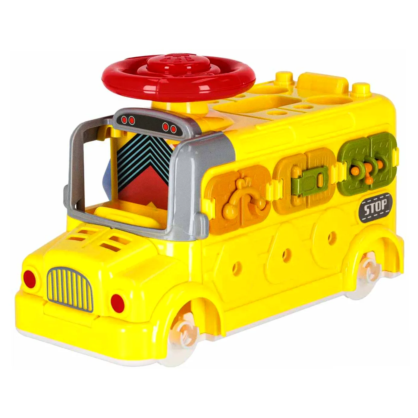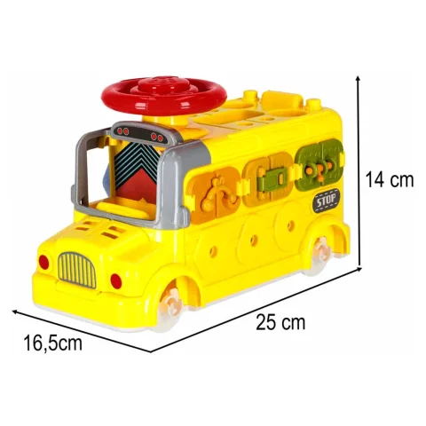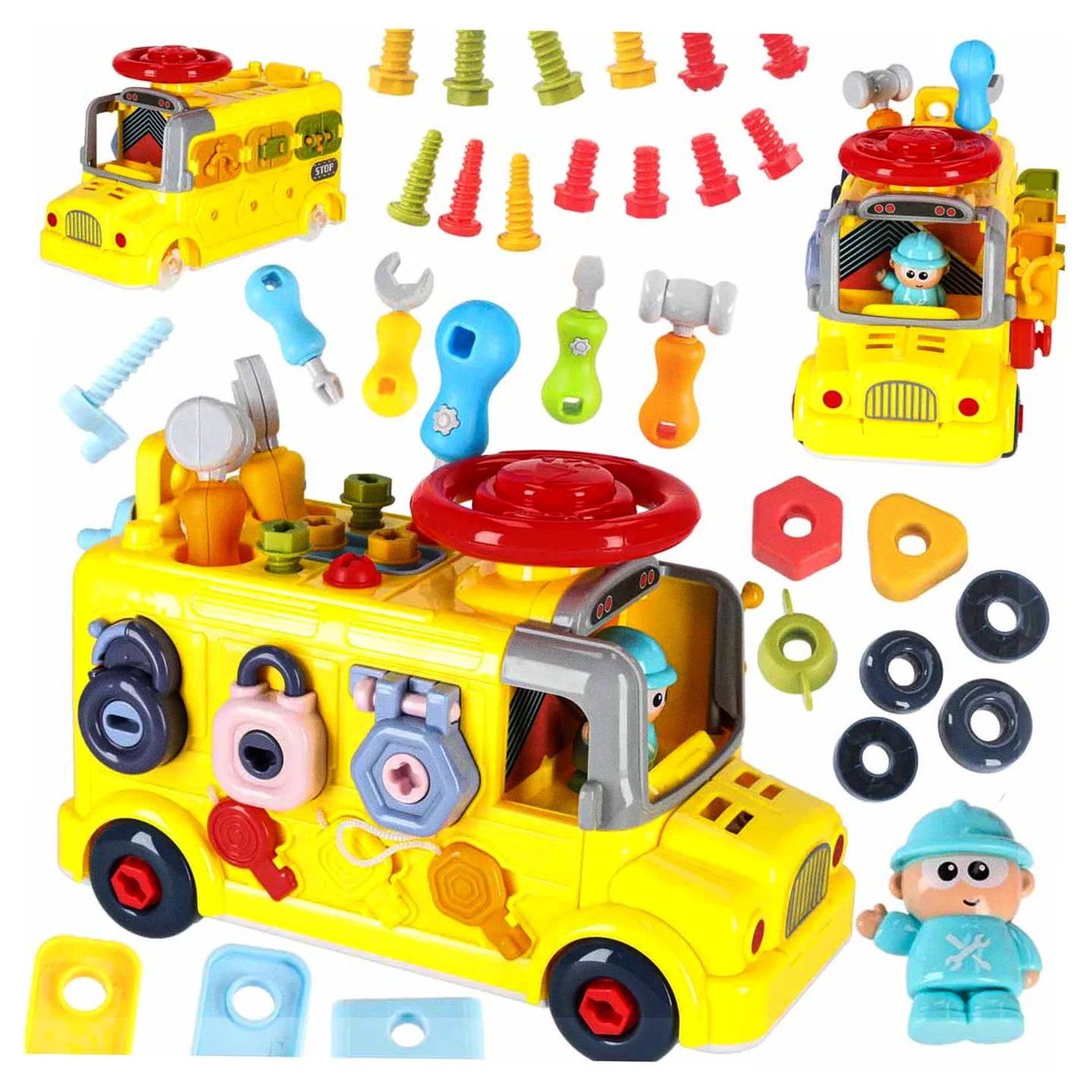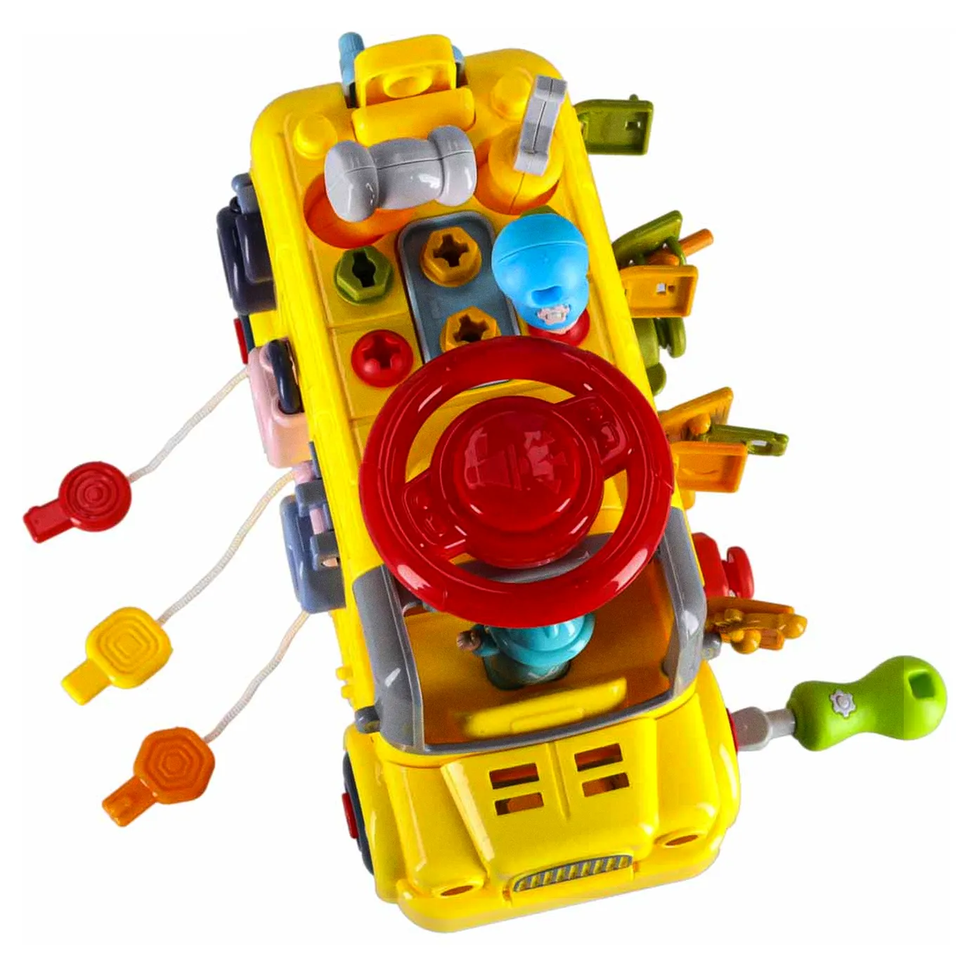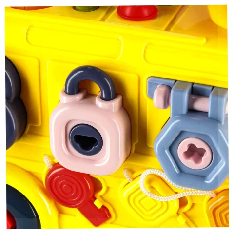 Jeżdżący autobus–auto do majsterkowania oferuje wiele ciekawych funkcji: podnoszoną maskę, otwierane drzwiczki tylne, obrotową kierownicę i klakson. Wkręcane kształty oraz kłódki z kluczykami zachęcają do eksperymentowania i rozwijają koordynację