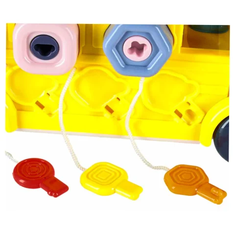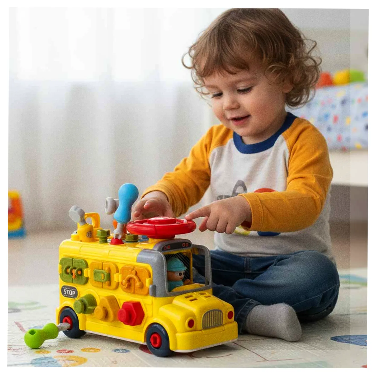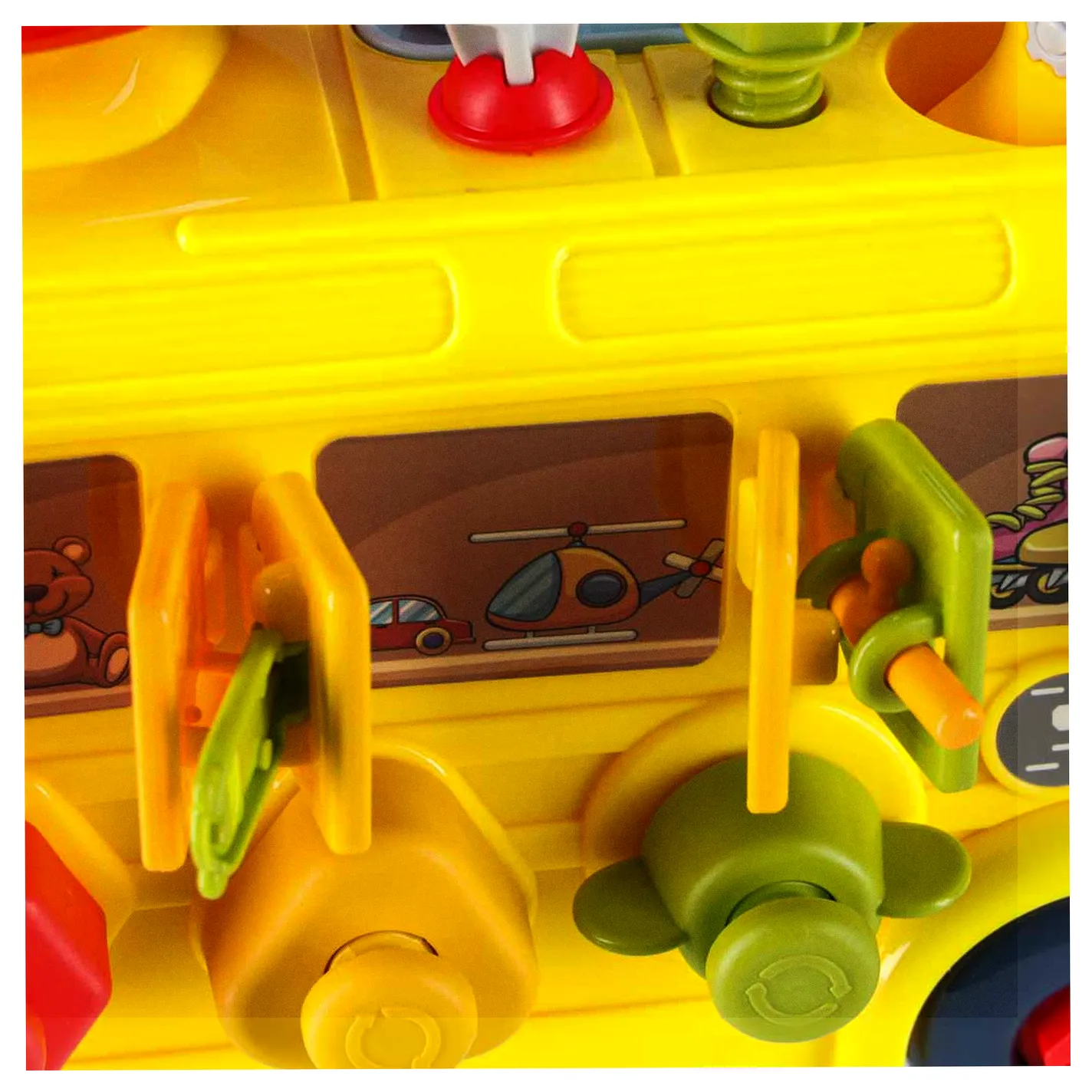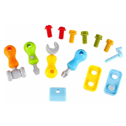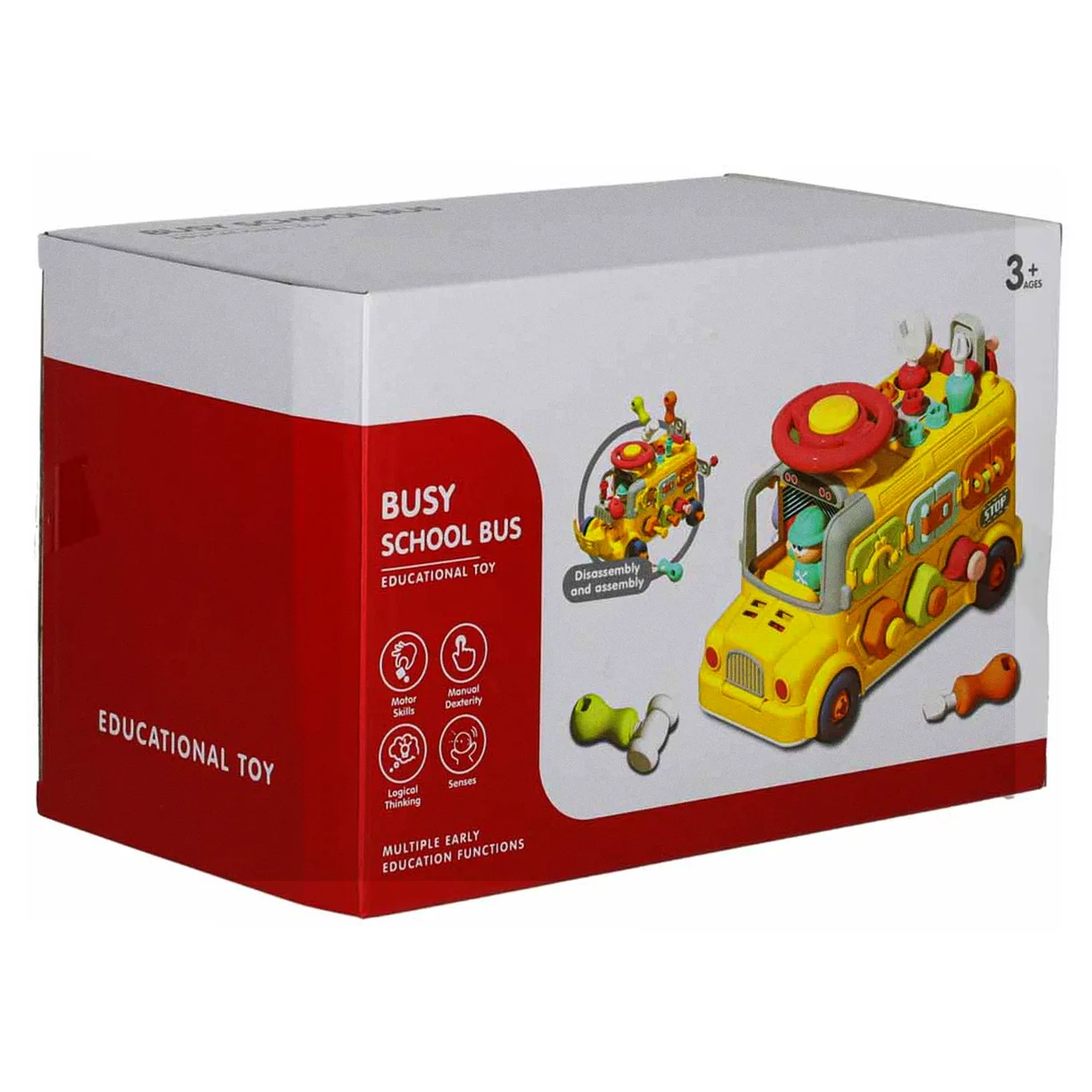 Jeżdżący autobus–auto do majsterkowania oferuje wiele ciekawych funkcji: podnoszoną maskę, otwierane drzwiczki tylne, obrotową kierownicę i klakson. Wkręcane kształty oraz kłódki z kluczykami zachęcają do eksperymentowania i rozwijają koordynację