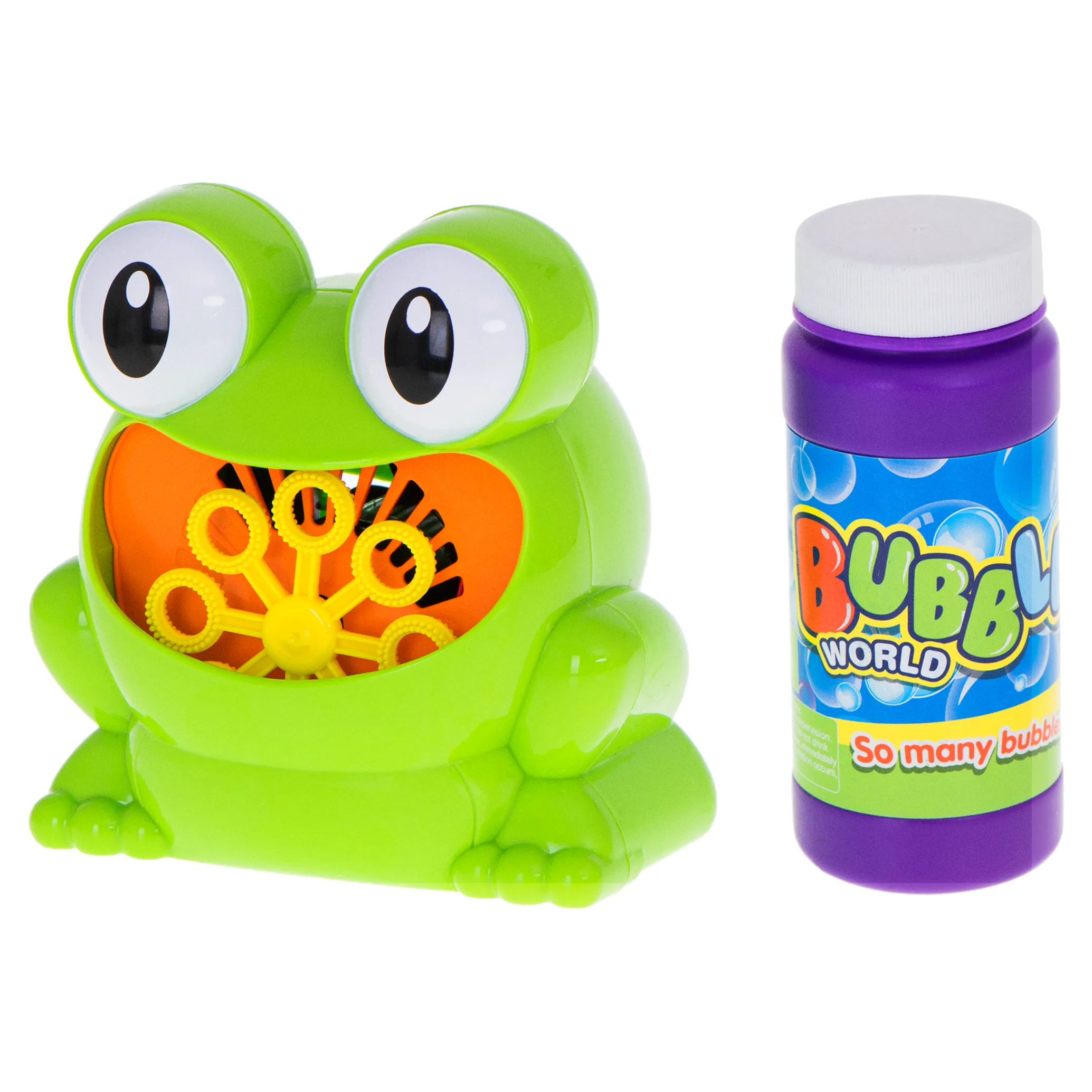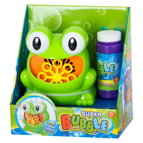 Maszynka w kształcie żaby do robienia baniek. Zapewni mnóstwo radości każdemu dziecku. Idealnie sprawdzi się podczas zabaw w ogrodzie. W zestawie: automat-żaba, butelka z płynem. Zasilanie: 4 baterie 1,5V VV (brak w zestawie). Wym. maszynki: 12x13x10cm.
