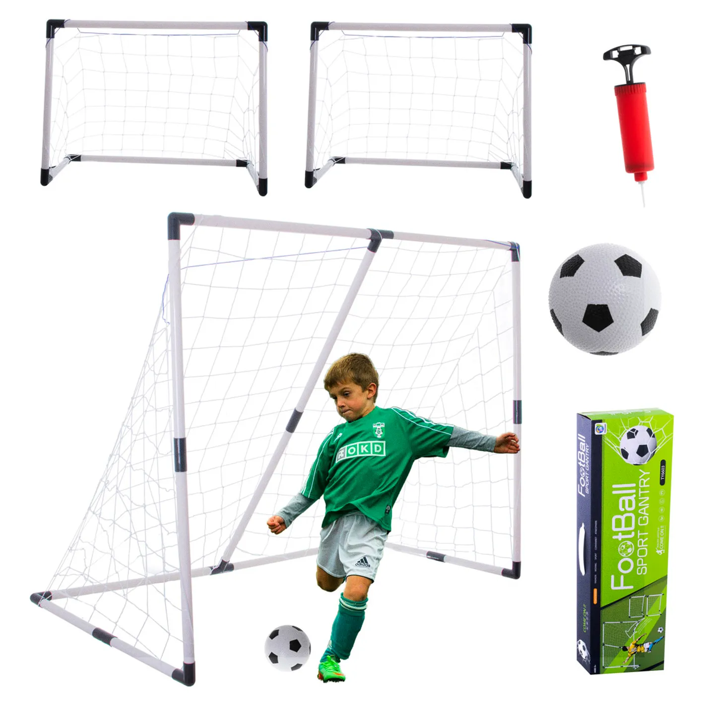 Bramka piłkarska 2w1 – jedna duża, którą można przekształcić w dwie mniejsze. W zestawie trzy siatki, piłka, pompka. Granie w piłkę niesie ze sobą wiele korzyści zdrowotnych oraz zapewni mnóstwo dobrej zabawy. Wiek: 3+. Duża bramka: 143 x 110 x 70 cm.