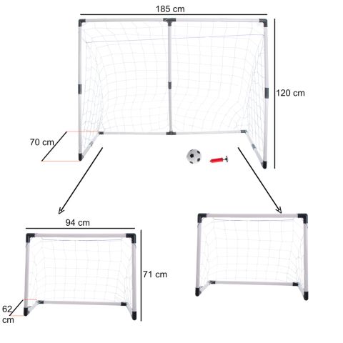 Bramka piłkarska 2w1 – jedna duża, którą można przekształcić w dwie mniejsze. W zestawie piłka i pompka. Granie w piłkę niesie ze sobą wiele korzyści zdrowotnych oraz zapewnia mnóstwo dobrej zabawy. Duża bramka: 70x185x120 cm. Mała bramka: 62x94x71 cm.