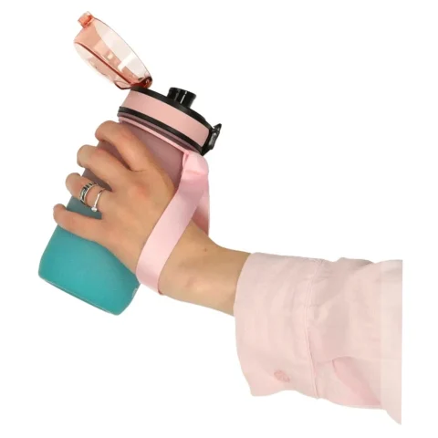 - Ma szeroką zawieszkę – smycz w postaci szerokiej tasiemki sprawia, że butelka jest poręczna