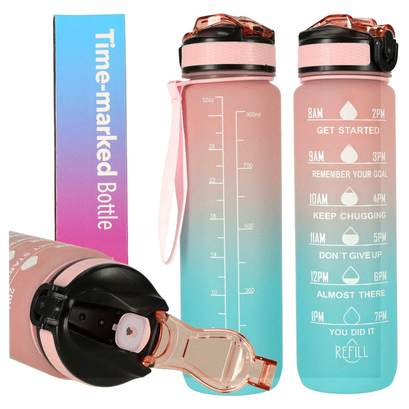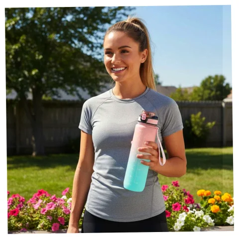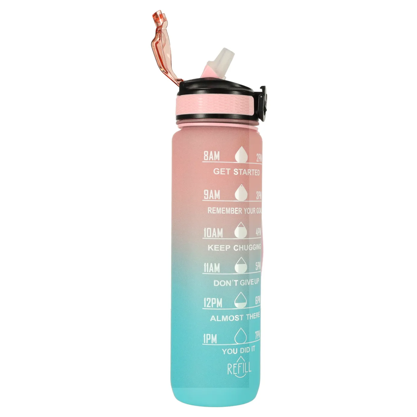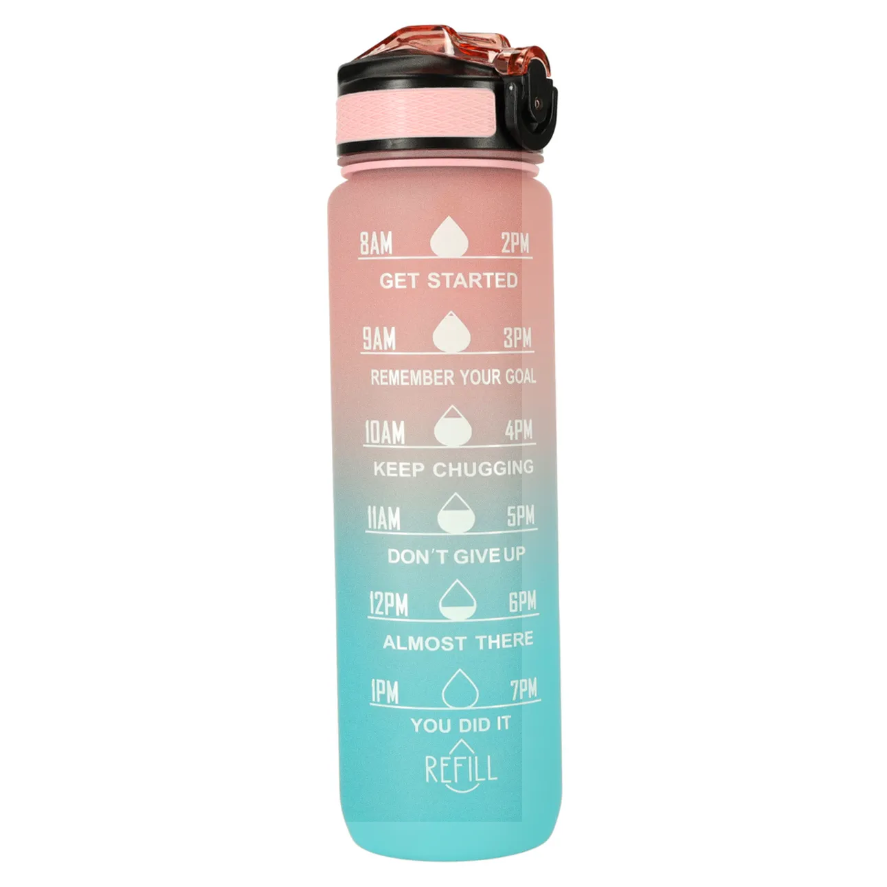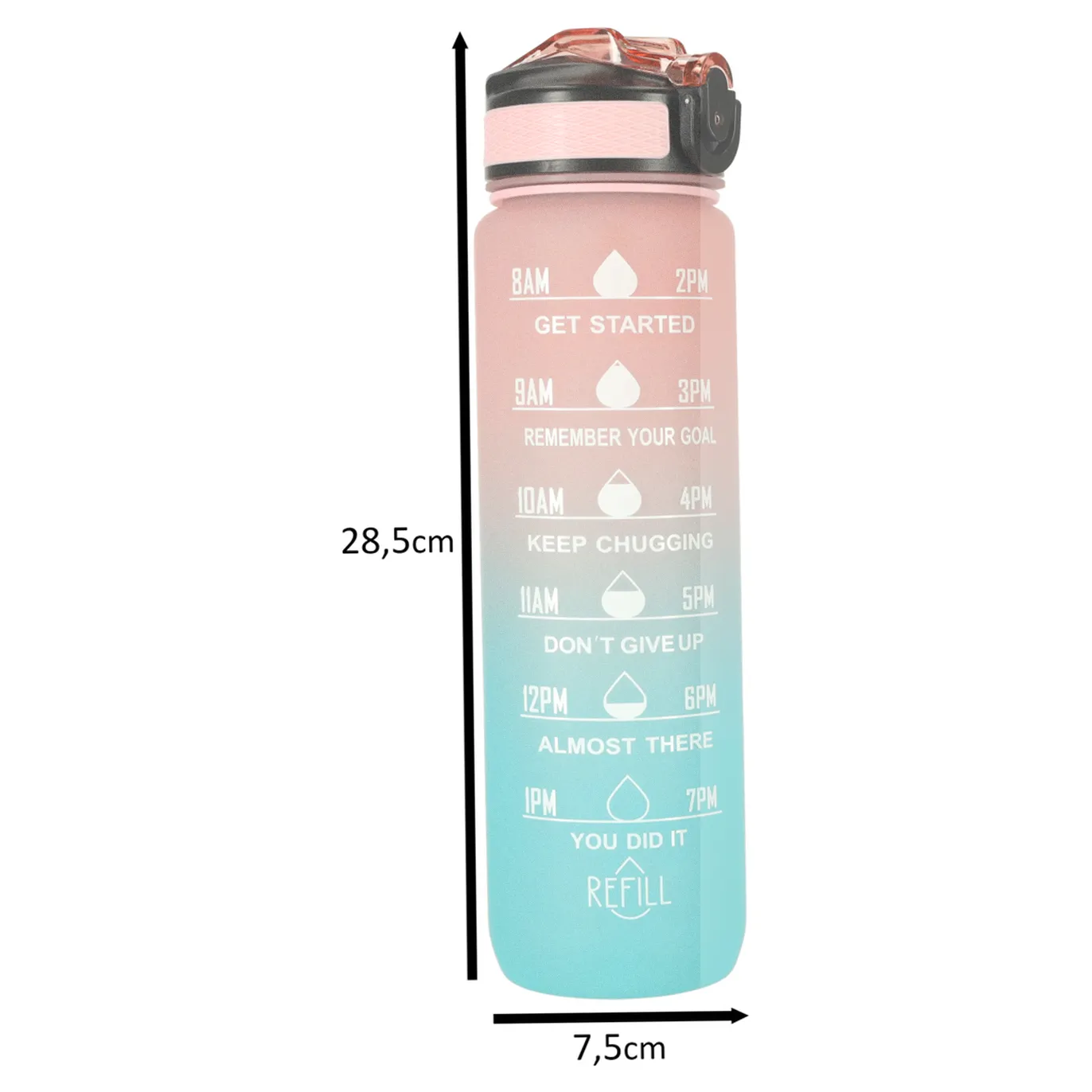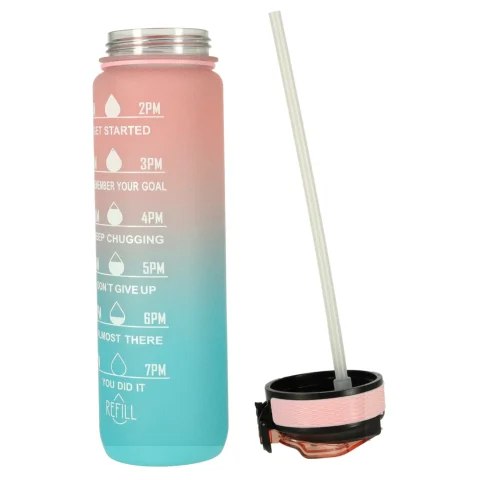 Butelka na wodę o pojemność 1 litra to idealny sposób, by pozostać nawodnionym przez cały dzień! Dzięki niej unikniesz konieczności kupowania jednorazowych butelek z wodą. Bidon wyposażony jest w praktyczny ustnik ze słomką, co sprawia, że picie z niego jest niezwykle wygodne i nie wymaga przechylania. Dodatkowo klips zabezpieczający chroni wieczko butelki przed przypadkowym otwarciem się. Miarka z godzinami i motywacyjnymi hasłami zachęca do regularnego picia wody. Wykonana została z wytrzymałego i bezpiecznego dla kontaktu z żywnością tritanu, niezawierającego BPA.