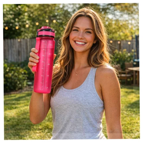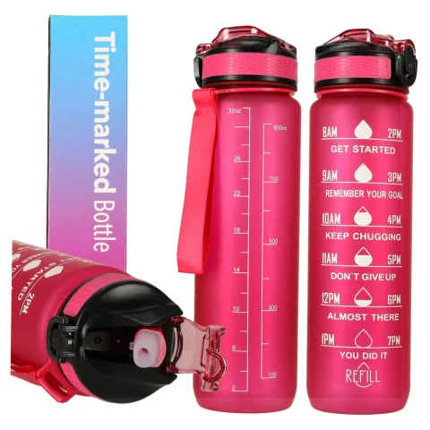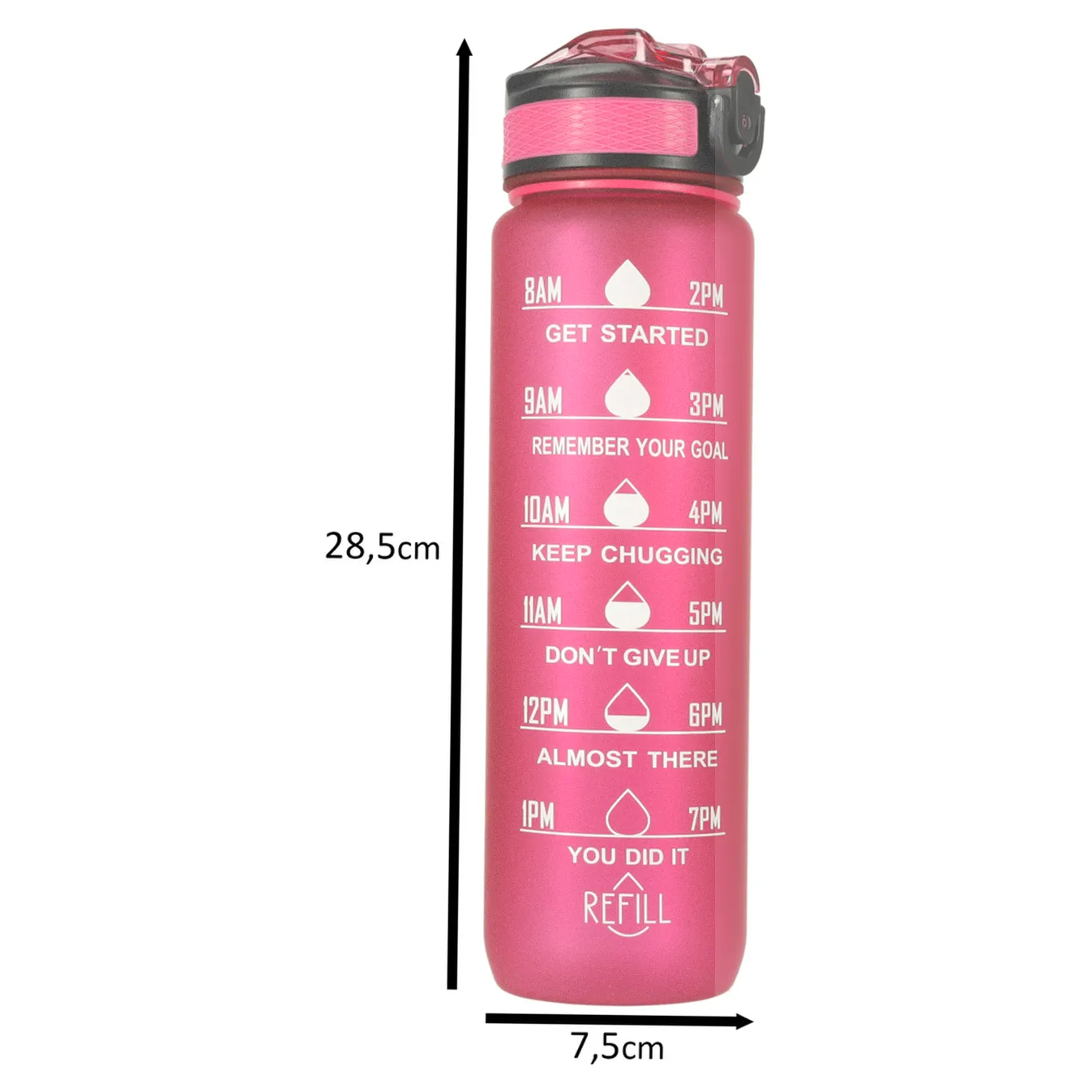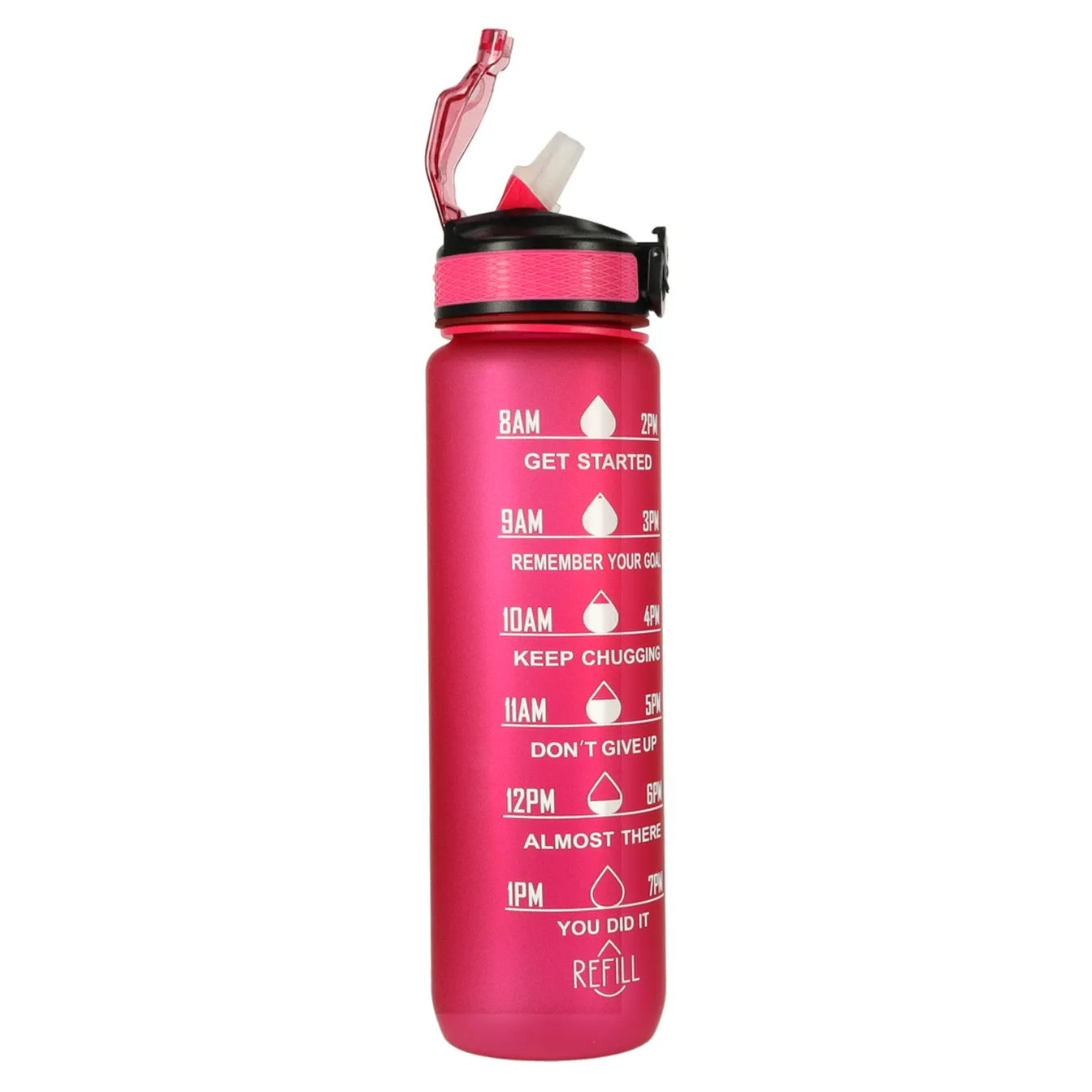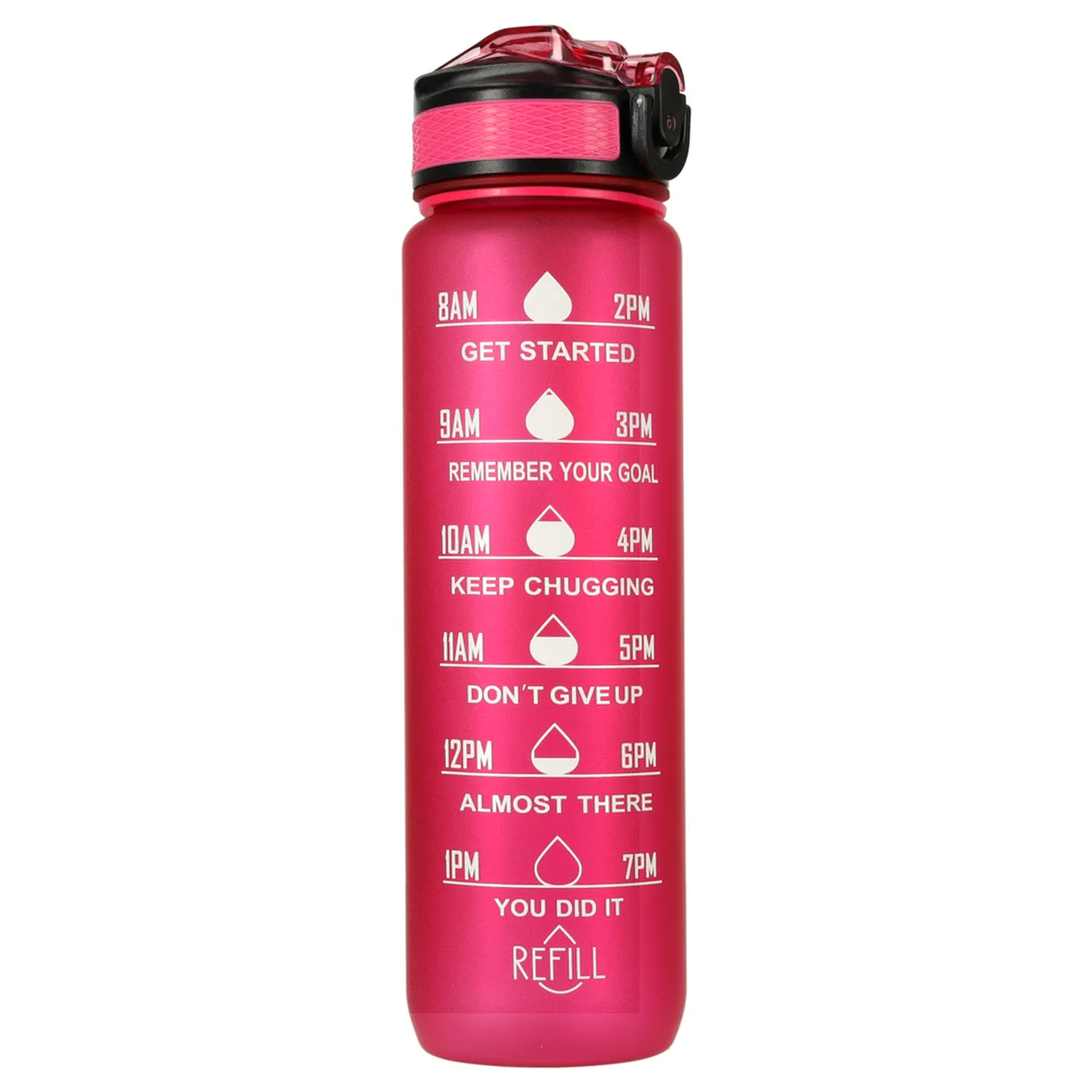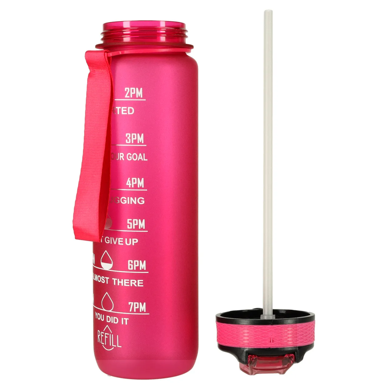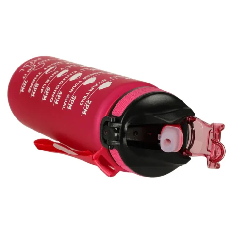 Butelka na wodę o pojemność 1 litra to idealny sposób, by pozostać nawodnionym przez cały dzień! Dzięki niej unikniesz konieczności kupowania jednorazowych butelek z wodą. Bidon wyposażony jest w praktyczny ustnik ze słomką, co sprawia, że picie z niego jest niezwykle wygodne i nie wymaga przechylania. Dodatkowo klips zabezpieczający chroni wieczko butelki przed przypadkowym otwarciem się. Miarka z godzinami i motywacyjnymi hasłami zachęca do regularnego picia wody. Wykonana została z wytrzymałego i bezpiecznego dla kontaktu z żywnością tritanu, niezawierającego BPA.