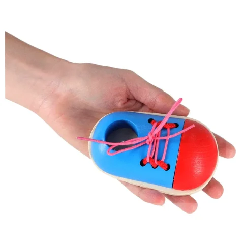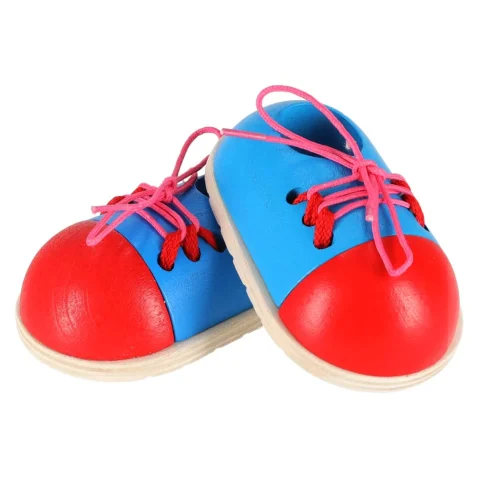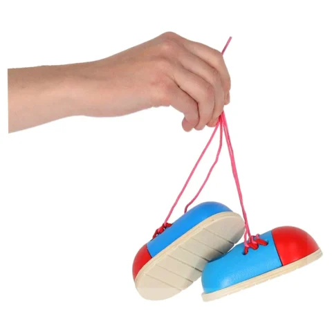 Zestaw edukacyjny do nauki wiązania sznurowadeł, zainteresuje niejedno dziecko, rozwija zdolności motoryczne dziecka. materiał: Drewno, wymiary: 6.8*3.5*11 cm, zestaw zawiera dwie pary butów