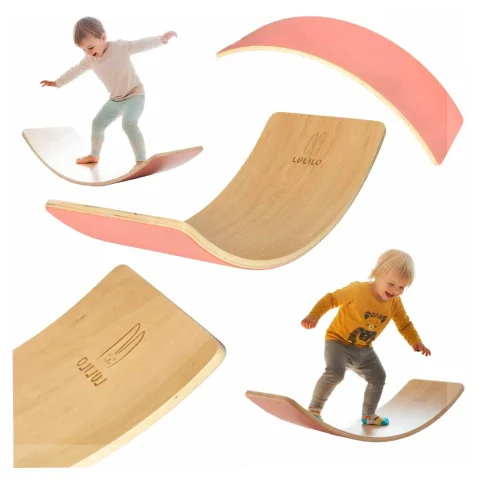 Deska do balansowania o zaokrąglonym kształcie do ćwiczeń równowagi dla dzieci i dorosłych. Z jednej strony jest wyłożona różowym filcem, dzięki czemu nie zarysowuje powierzchni. Do użytku w domu, w szkole, w świetlicy lub na sali gimnastycznej.