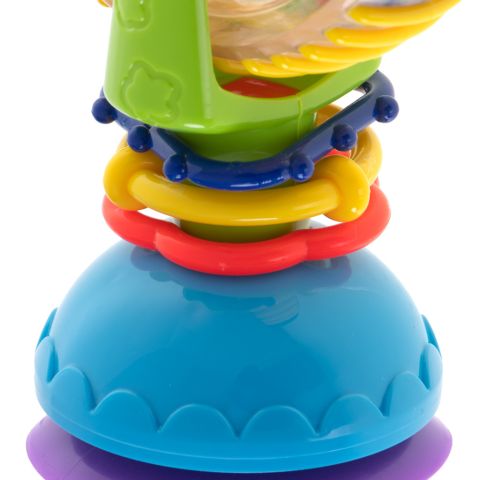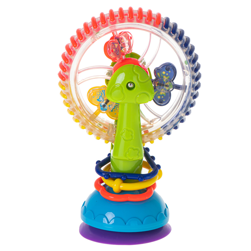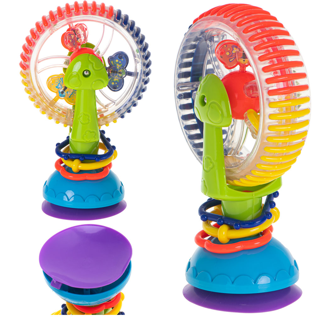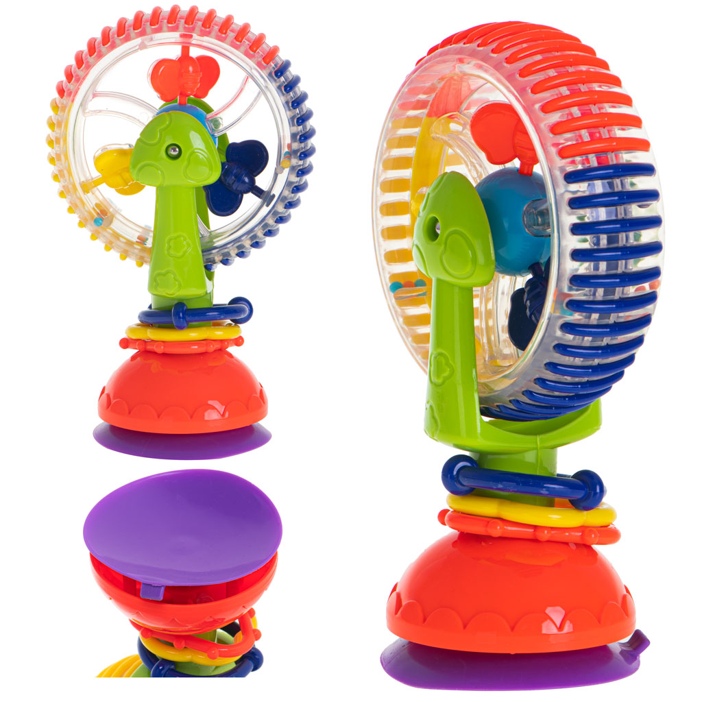 Kolorowa zabawka dla dzieci w kształcie diabelskiego młyna. Zabawka pełni funcję grzechotki. Doskonale nadaje się do zabwy w wodzie. Wyposażona została w przyssawki, dzięki którym nie będzie przesuwać się podczas zabawy. Wymiary:17cm x 11,cm
