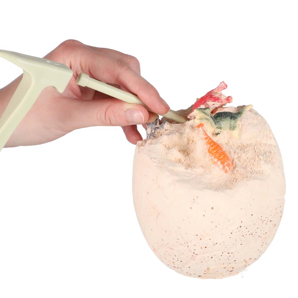 Zestaw archeologiczny wykopaliska –duże jajko z 12 dinozaurami. W środku gipsowego jajka ukryte figurki prehistorycznych stworzeń. Zestaw zawiera narzędzia do wykopalisk, instrukcję i kartę informacyjną. Edukacyjna zabawka rozwijająca ciekawość i precyzję