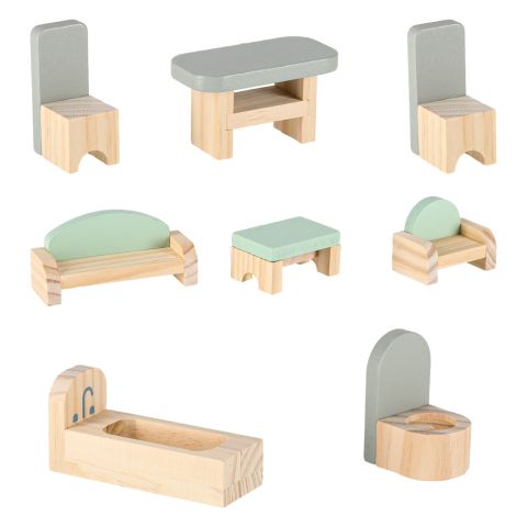 - Mebelki – wanna, toaleta, lampa, sofa, fotel, stół, 2x krzesła, łóżko i otwierana szafka z półeczkami