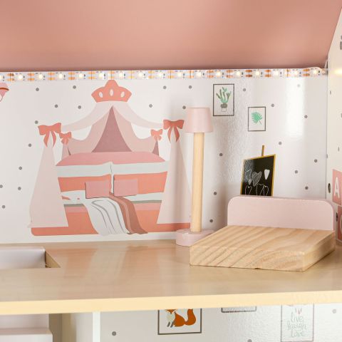 - Ma wbudowane oświetlenie LED – ciepłe światło tworzy w domku dla lalek przytulną atmosferę