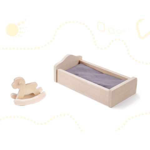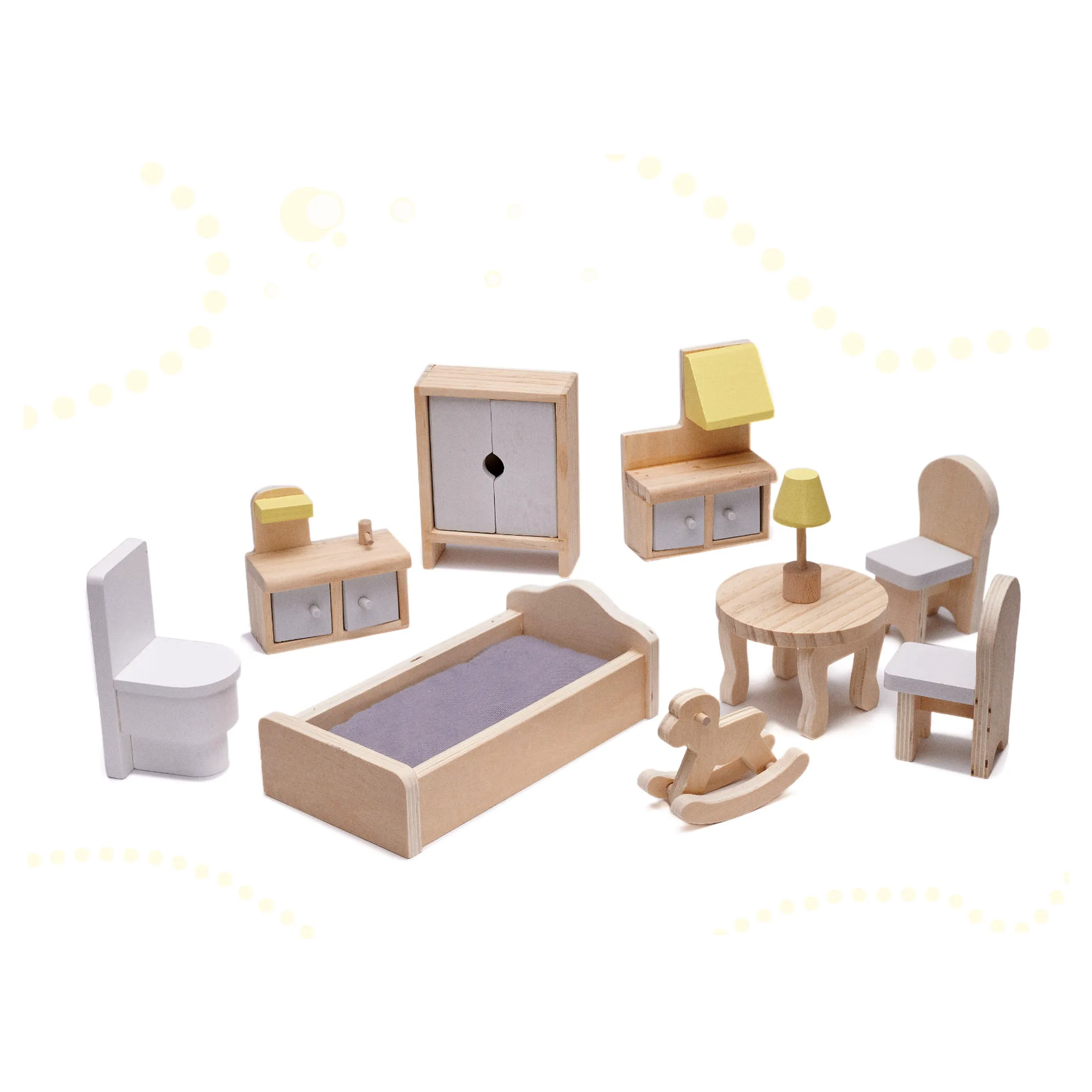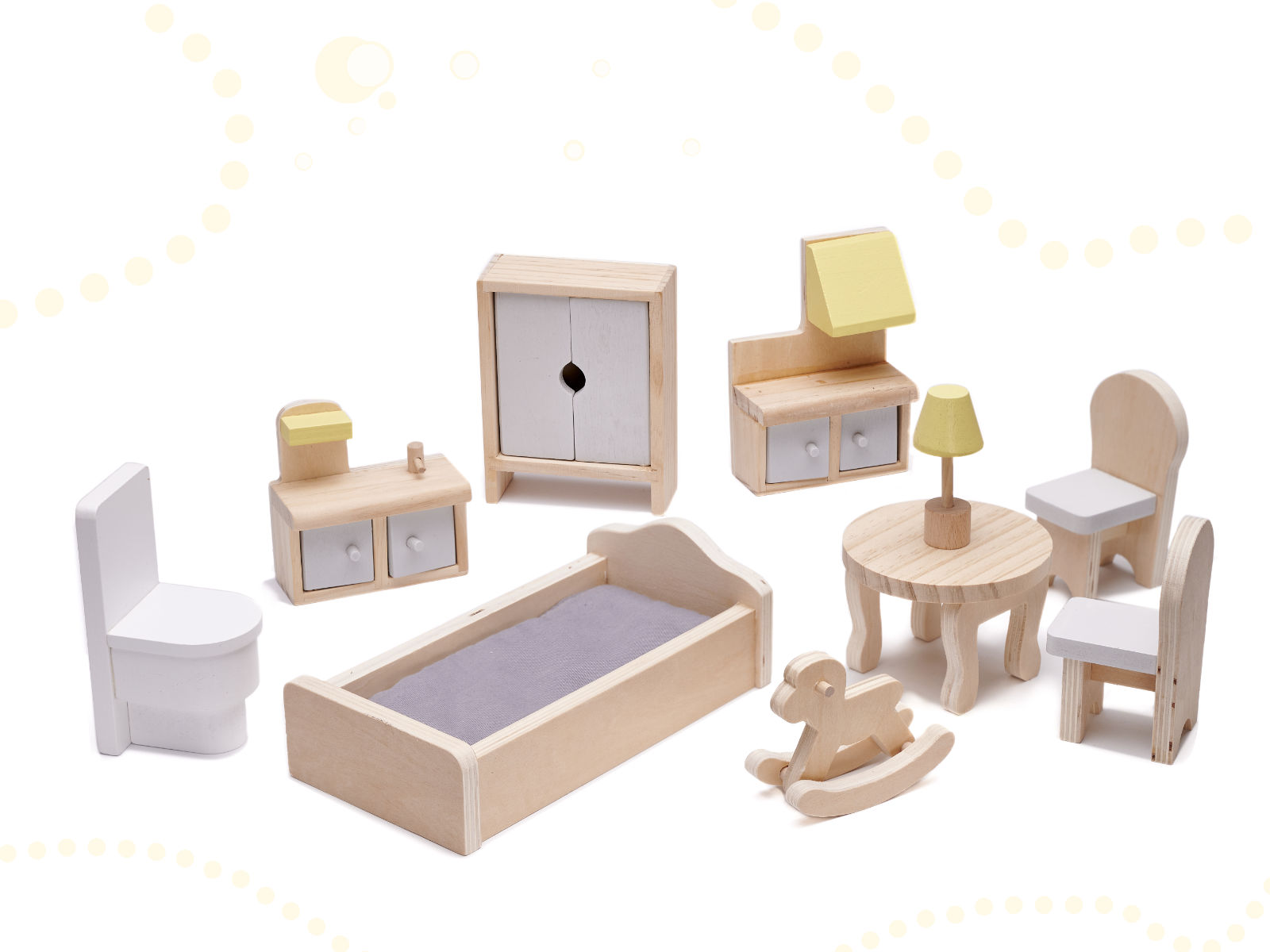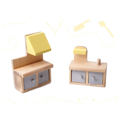 - Meble (10 szt.): 2 krzesełka, stolik, lampka, łóżko, koń na biegunach, szafa, szafka ze zlewem, kuchenka, toaleta