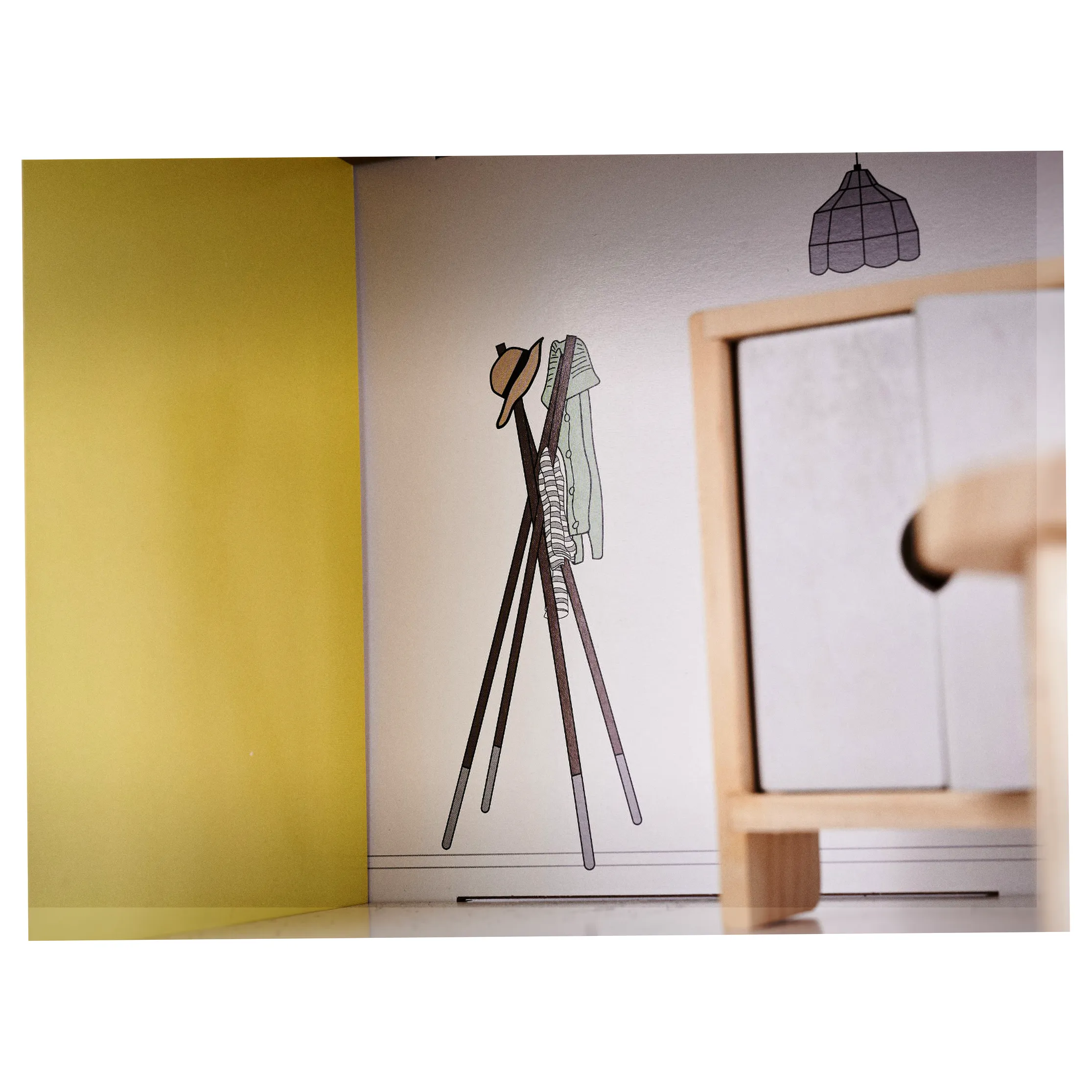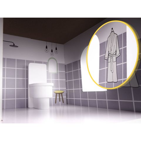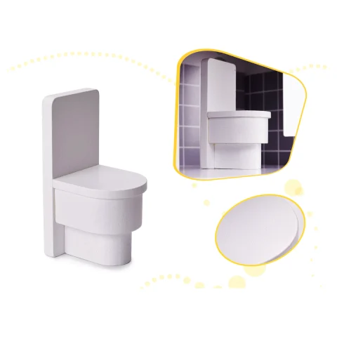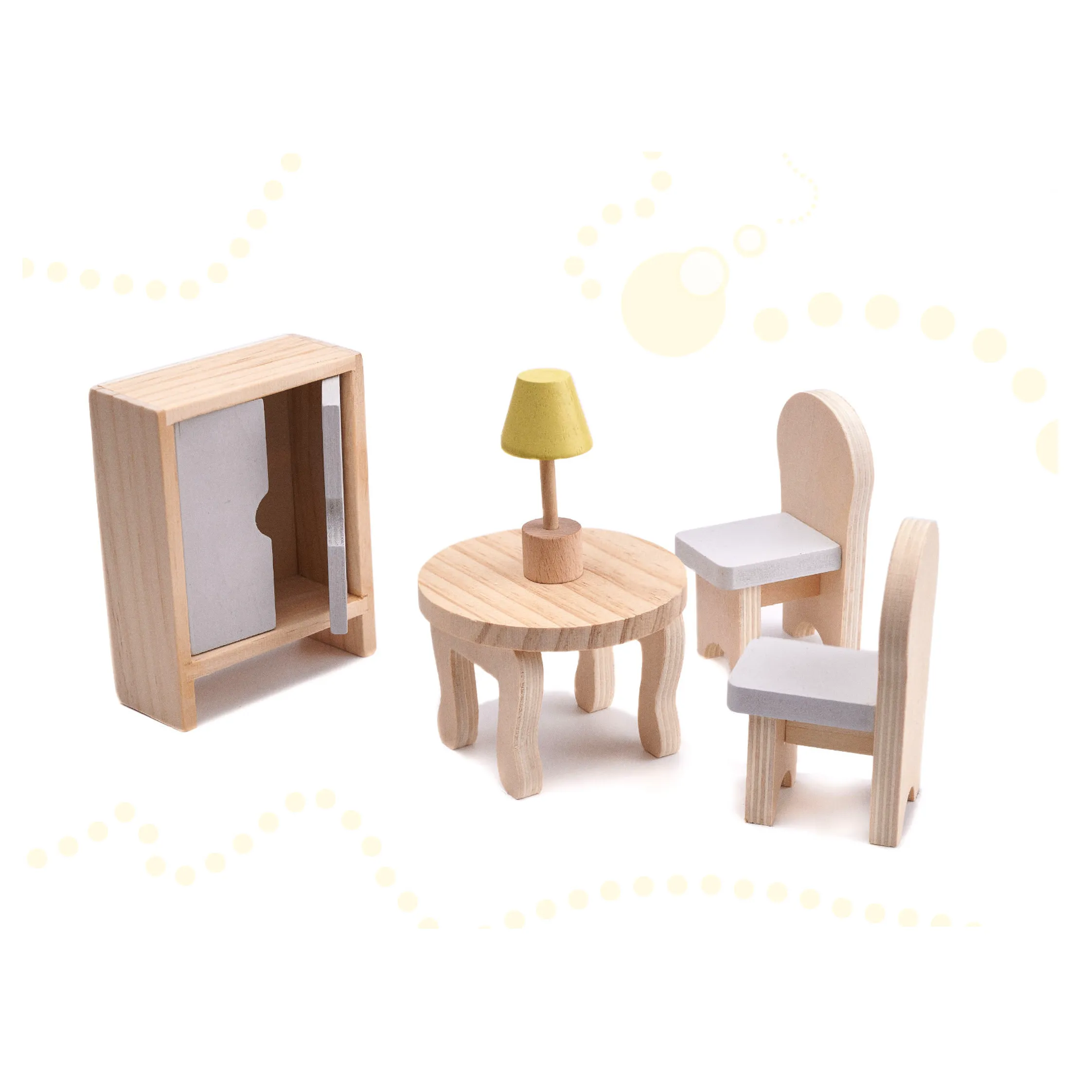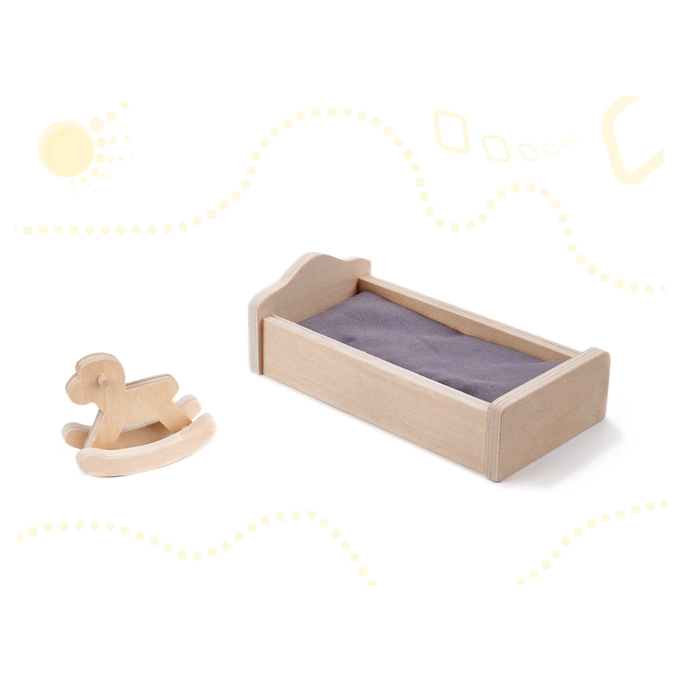 - Meble (10 szt.): 2 krzesełka, stolik, lampka, łóżko, koń na biegunach, szafa, szafka ze zlewem, kuchenka, toaleta