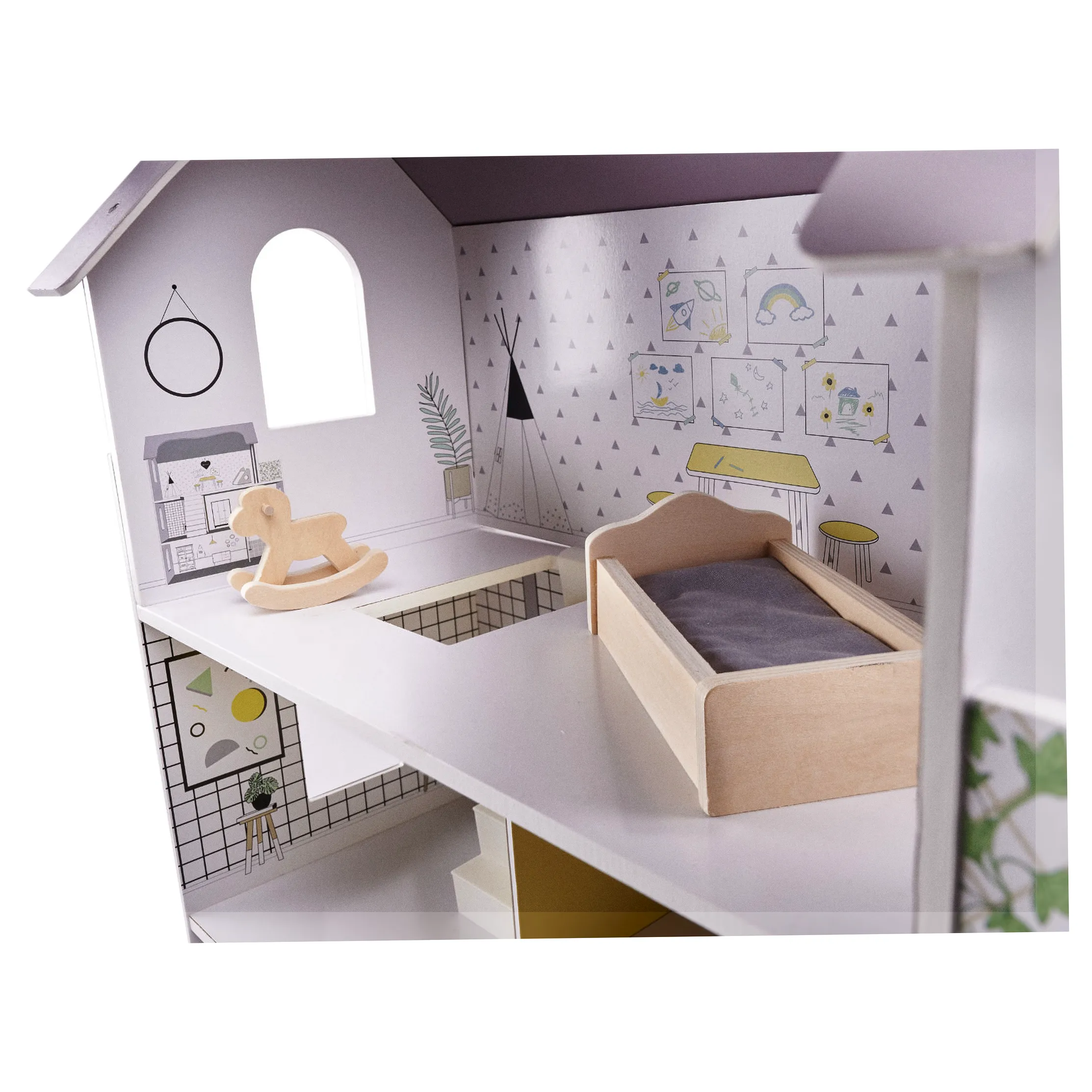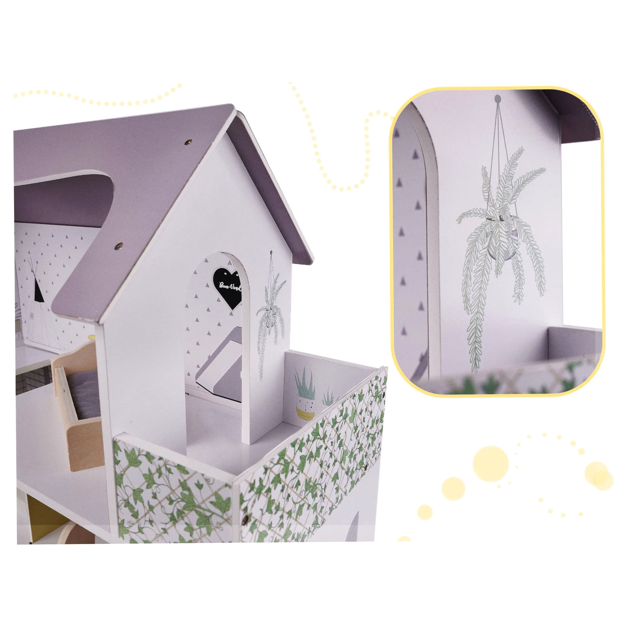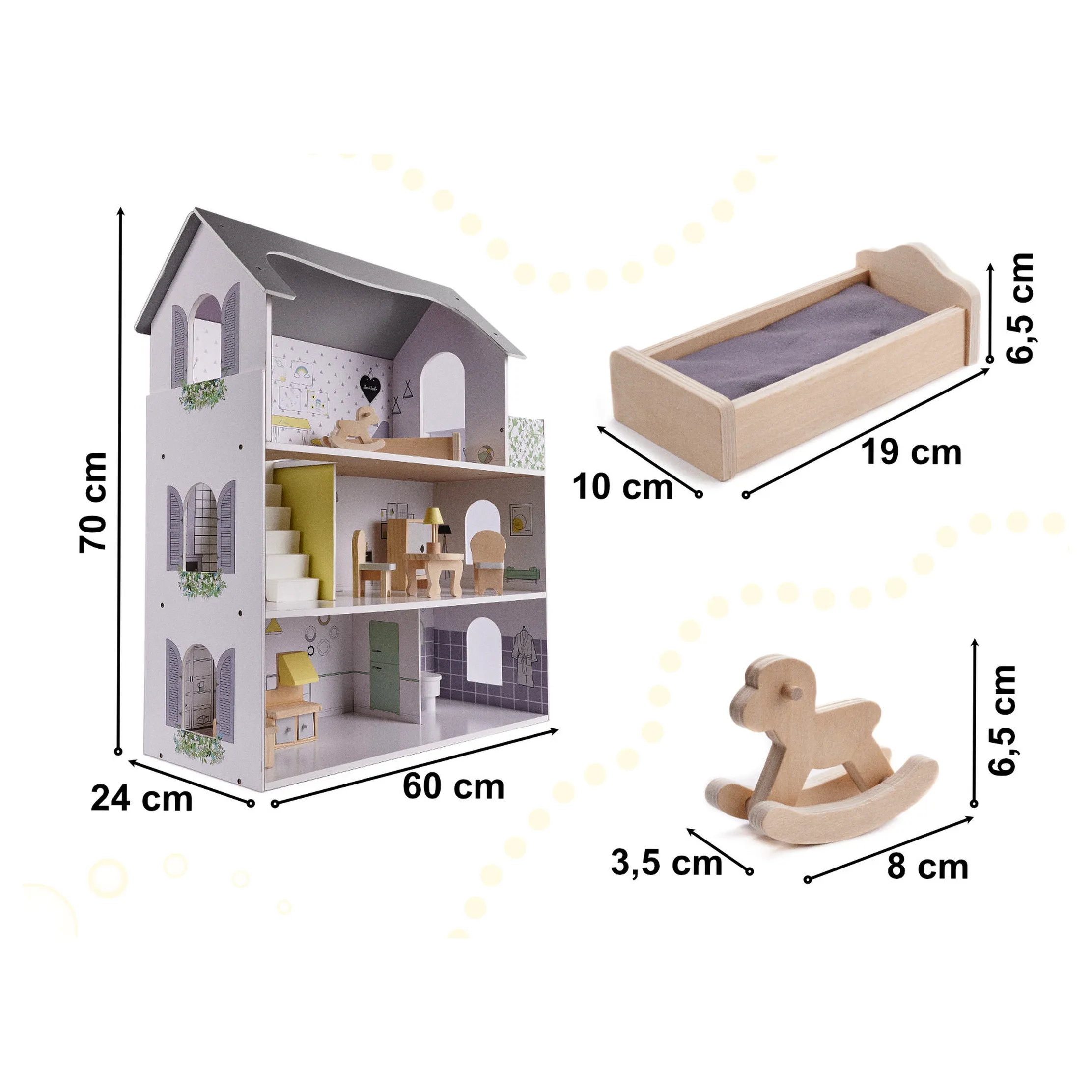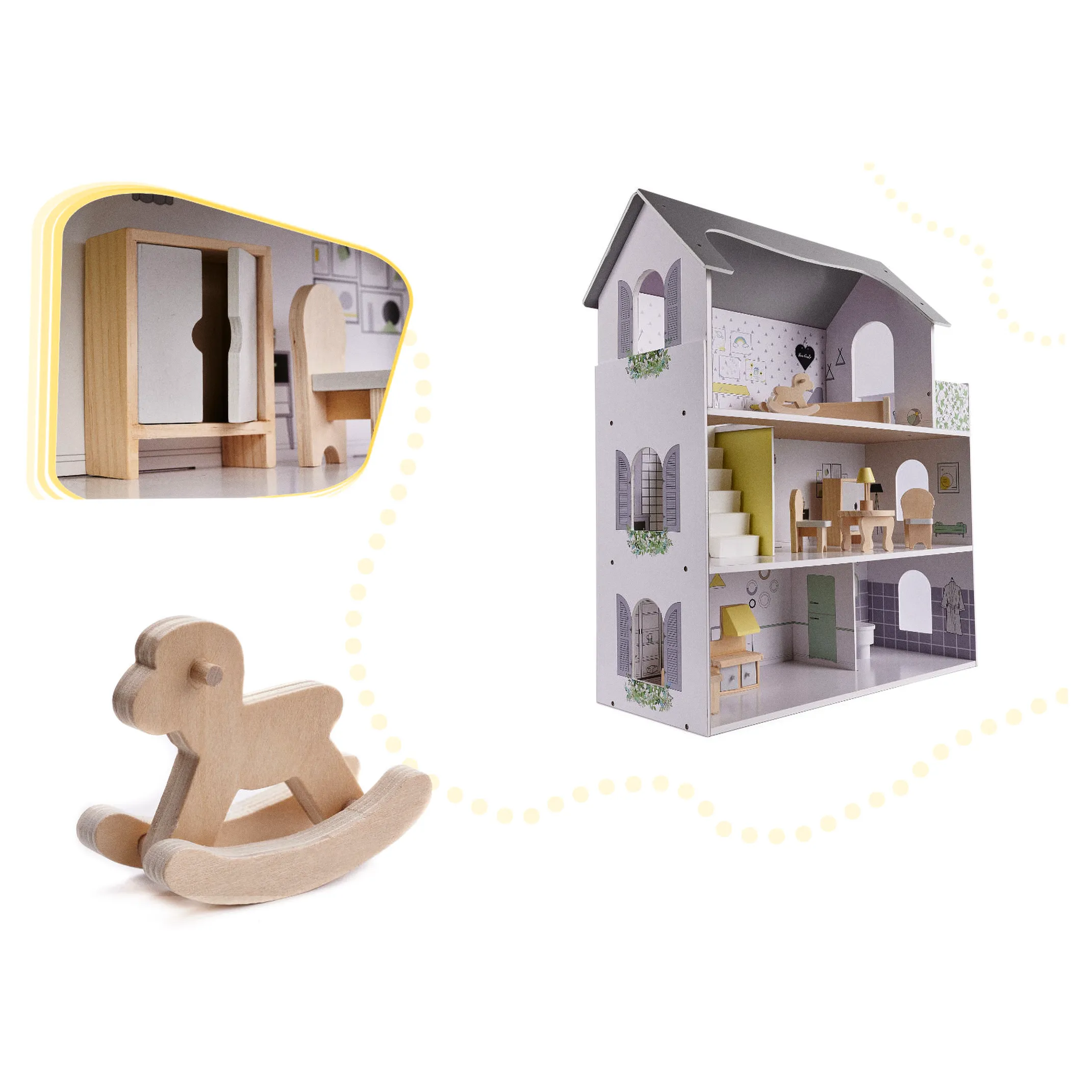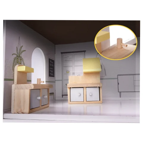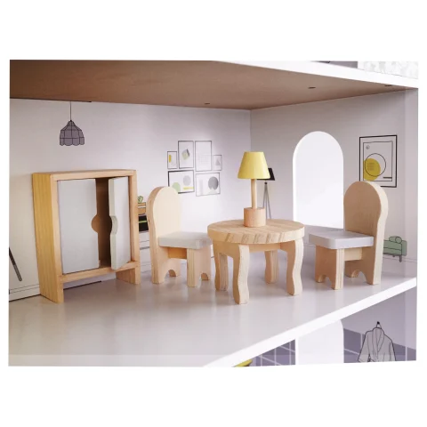 Domek dla lalek z przestronnymi wnętrzami daje wiele możliwości aranżacji oraz adaptacji. Małe mebelki są starannie wyszlifowane i pomalowane, by zapewnić komfortową i bezpieczną zabawę. Domek w minimalistycznej estetyce robi wrażenie swoim rozmiarem, a do tego gustownie się prezentuje. Sprawdzi się jako prezent okolicznościowy z okazji świąt czy urodzin.