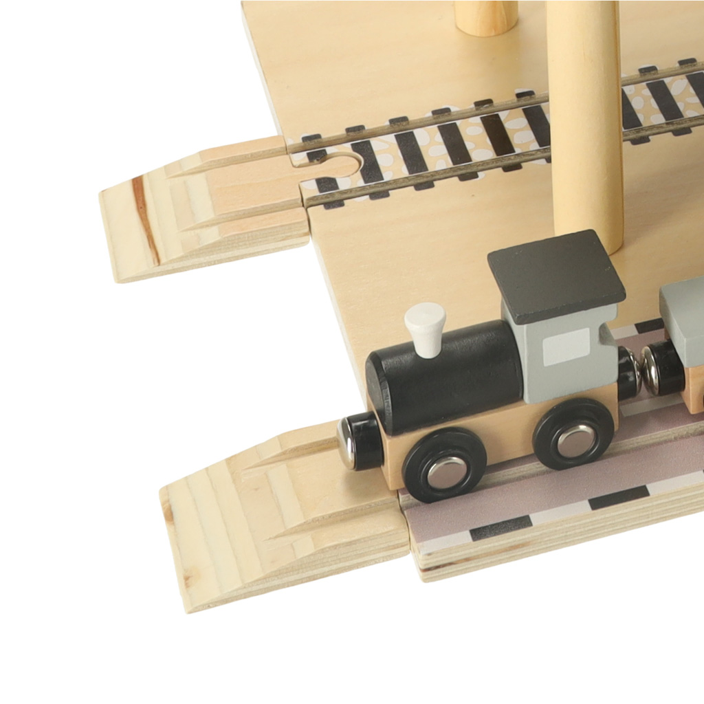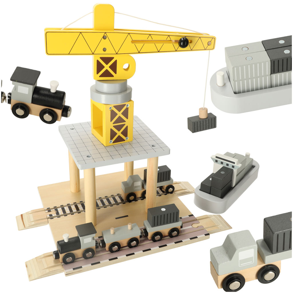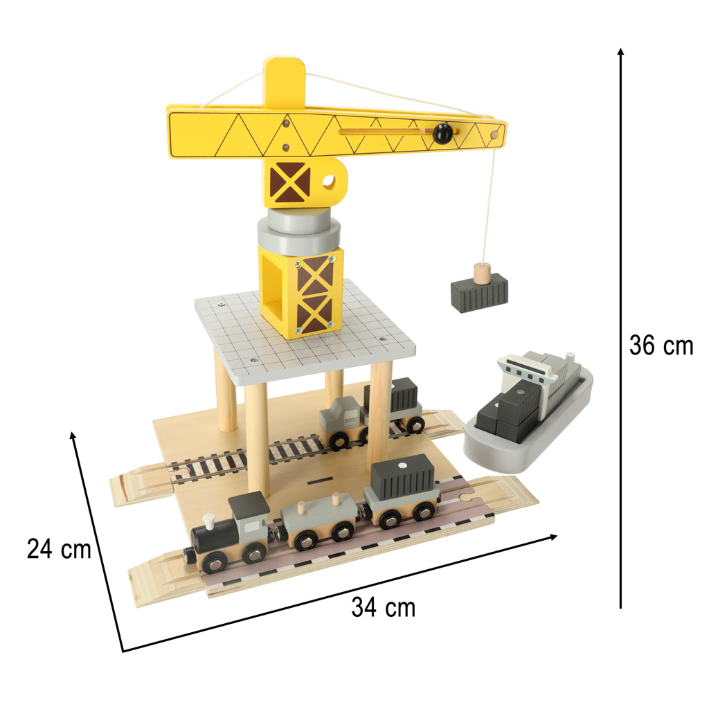 Drewniany port morski z dźwigiem to wspaniała zabawka dla małych miłośników transportu i budownictwa. Zestaw składa się z żółtego żurawia portowego, którym można obracać i podnosić kontenery ze statku na pojazdy transportowe – ciężarówkę i pociąg z dwoma wagonami. Różnorodne elementy pozwalają dziecku na odgrywanie scenek niczym z prawdziwego portu, rozwijając swoją kreatywność, zdolności manualne oraz koordynację ruchową.