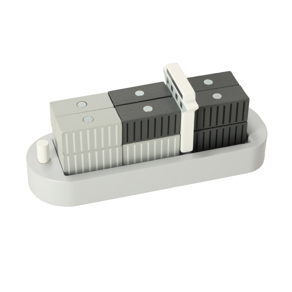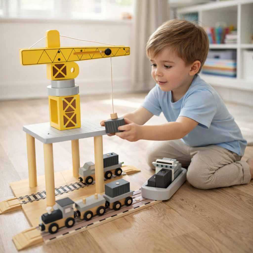 - interaktywna zabawa – żuraw jest centralnym elementem zabawki, który umożliwia dziecku obracanie i unoszenie kontenerów, symulując przy tym pracę prawdziwego portu przeładunkowego
