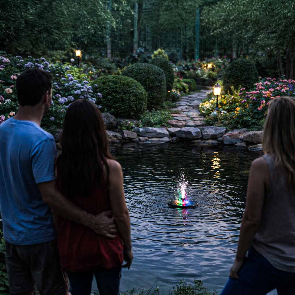 Solarny zestaw fontannowy RGB został wyposażony w wydajną pompę wodną, która pozwala uzyskać efektowny wodotrysk, dynamiczne strumienie i różnorodne efekty wodne. Pływająca fontanna pracuje cicho i stabilnie, wspierając naturalną cyrkulację wody, co korzystnie wpływa na warunki panujące w zbiorniku. To połączenie funkcjonalności i estetyki, które sprawia, że solarna fontanna rgb staje się centralnym punktem ogrodu.