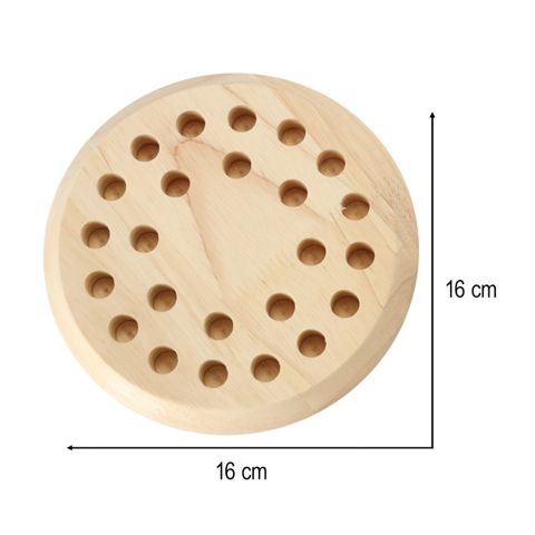 Drewniana gra logiczna chińczyk. Polega na wyrzuceniu kostką koloru, odnalezieniu go na planszy i zebraniu jak najwięcej pionków. Gra wspomoże pamięć i logiczne myślenie. W zestawie: okrągła podstawa, 24 pionki i kostka. Średnica podstawy: 16cm.