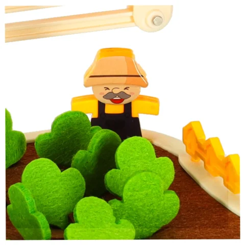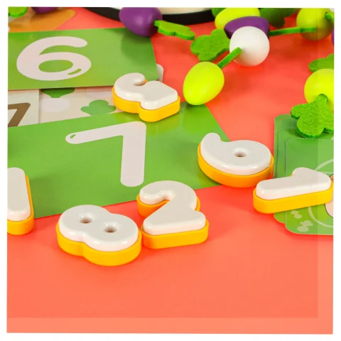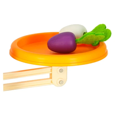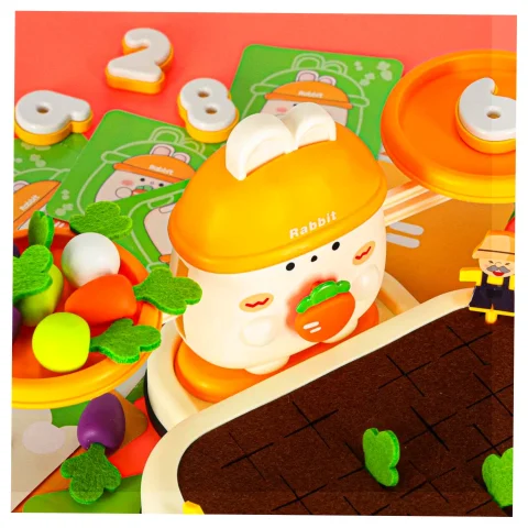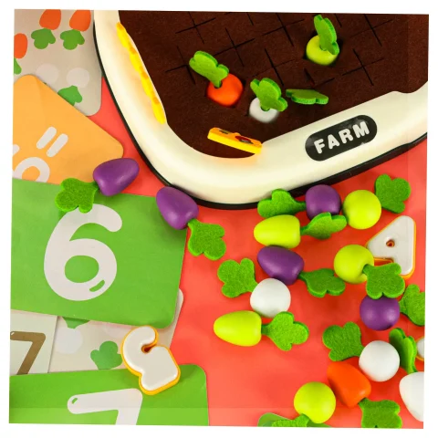 Specjalnie zaprojektowana plansza z otworami pozwala dziecku ćwiczyć precyzję ruchów – wkładanie i wyjmowanie marchewek rozwija sprawność manualną, a zabawa w „kto szybciej zbierze plony” wprowadza nutkę zdrowej rywalizacji.