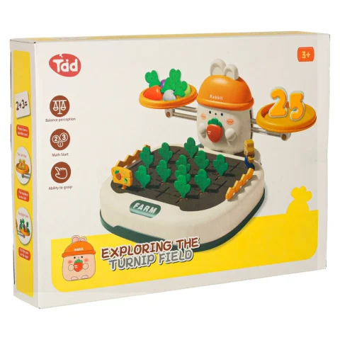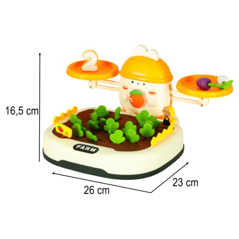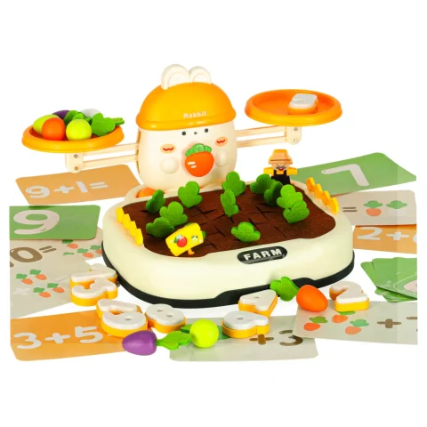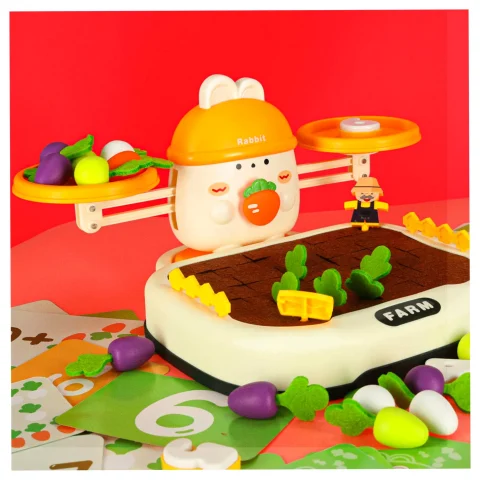 Na górze zestawu króluje uroczy królik, który „pilnuje” równowagi. Dziecko może układać marchewki lub inne elementy, starając się zachować równowagę albo świadomie ją zakłócać, ucząc się przy tym podstaw fizyki i logicznego myślenia. Do zestawu dołączone są również specjalne cyferki – każda z nich ma odpowiednio dobraną wagę, odpowiadającą reprezentowanej liczbie. Dzięki temu maluch może eksperymentować, porównując ciężar i ucząc się wartości liczbowych w praktyce! Zabawa ta świetnie wspiera naukę liczenia i podstawowych pojęć matematycznych.