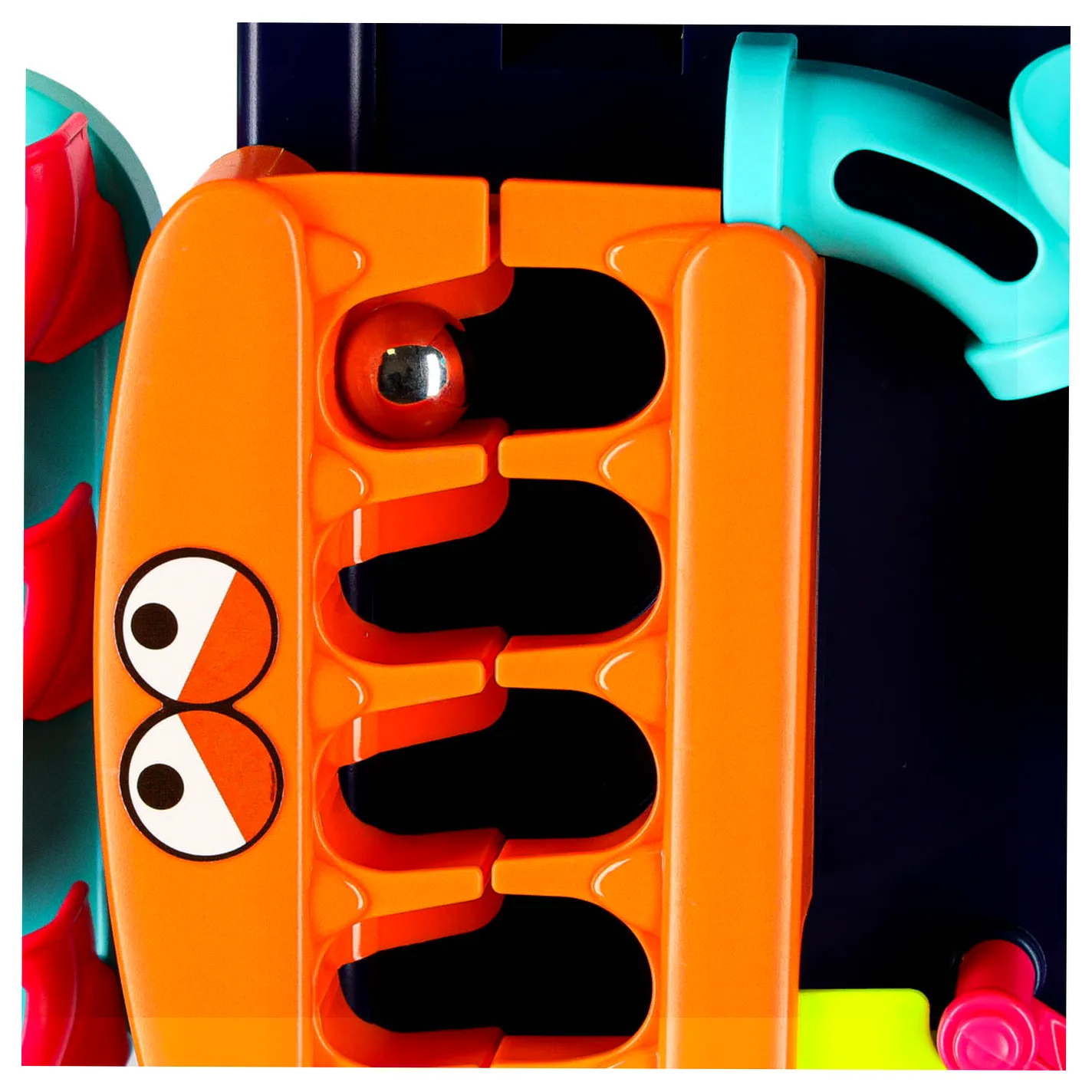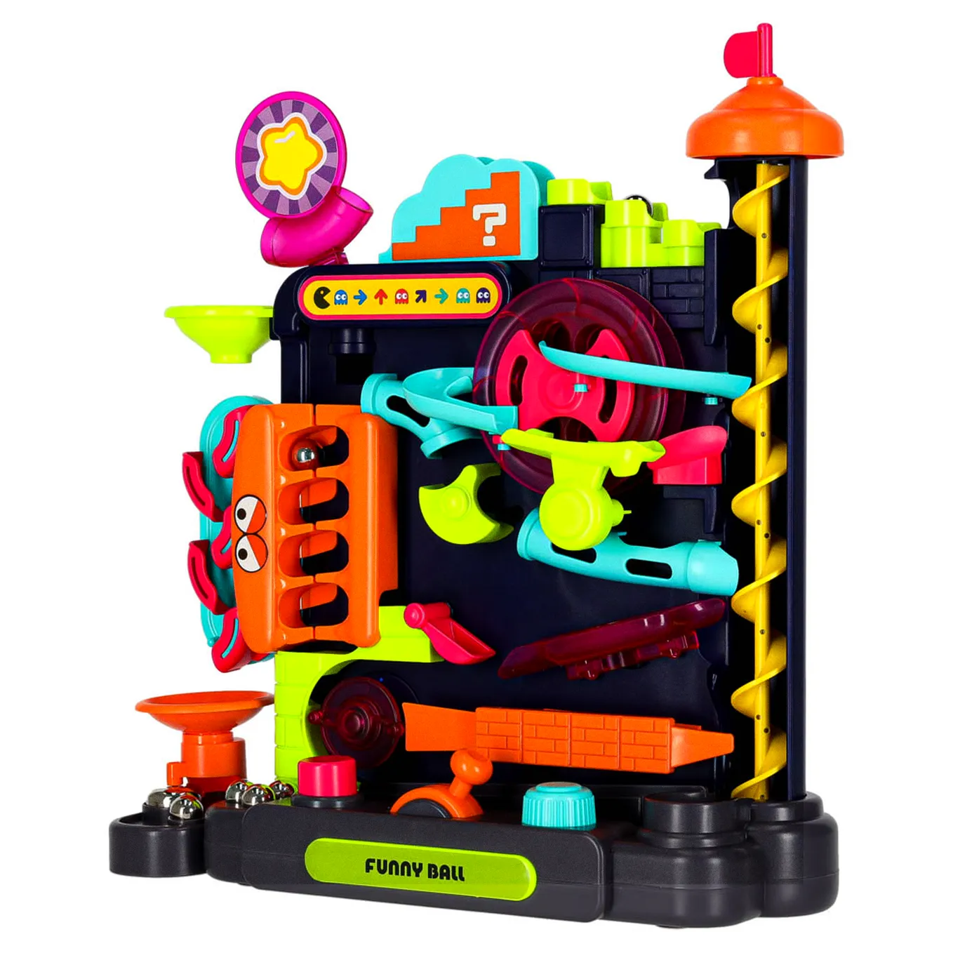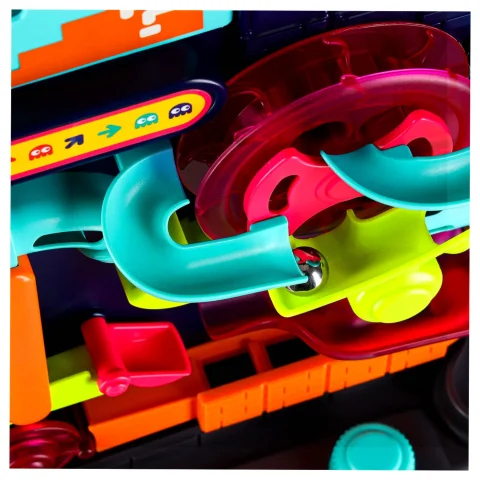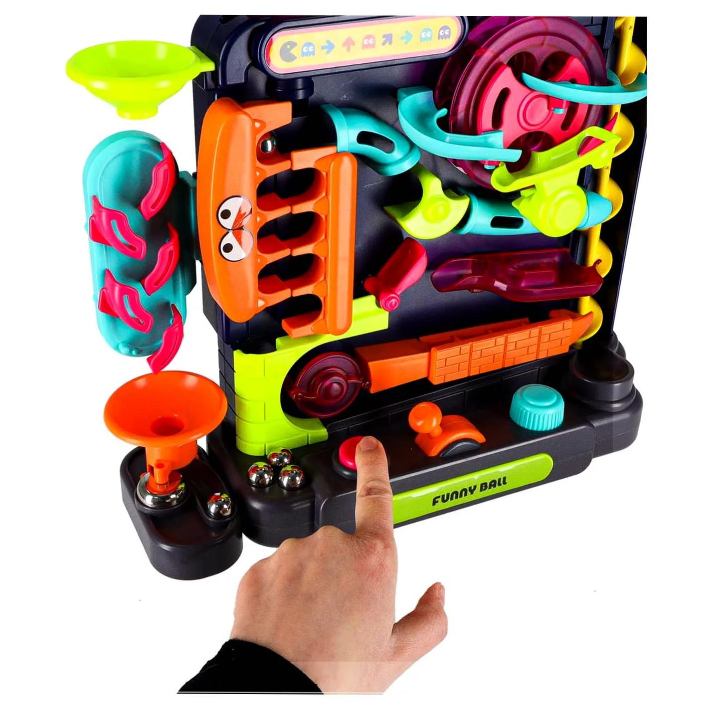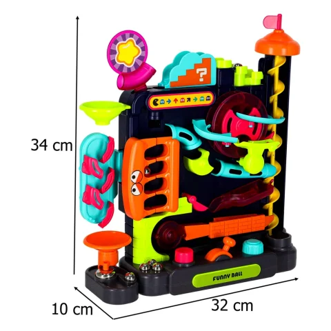 Kulkowy tor przeszkód STEM rozwijający logiczne myślenie, zręczność i motorykę. Poruszaj elementami na planszy za pomocą dźwigni i pokręteł, by kulki potoczyły się do celu. Wymiary zabawki: 32 cm x 34 cm x 10 cm