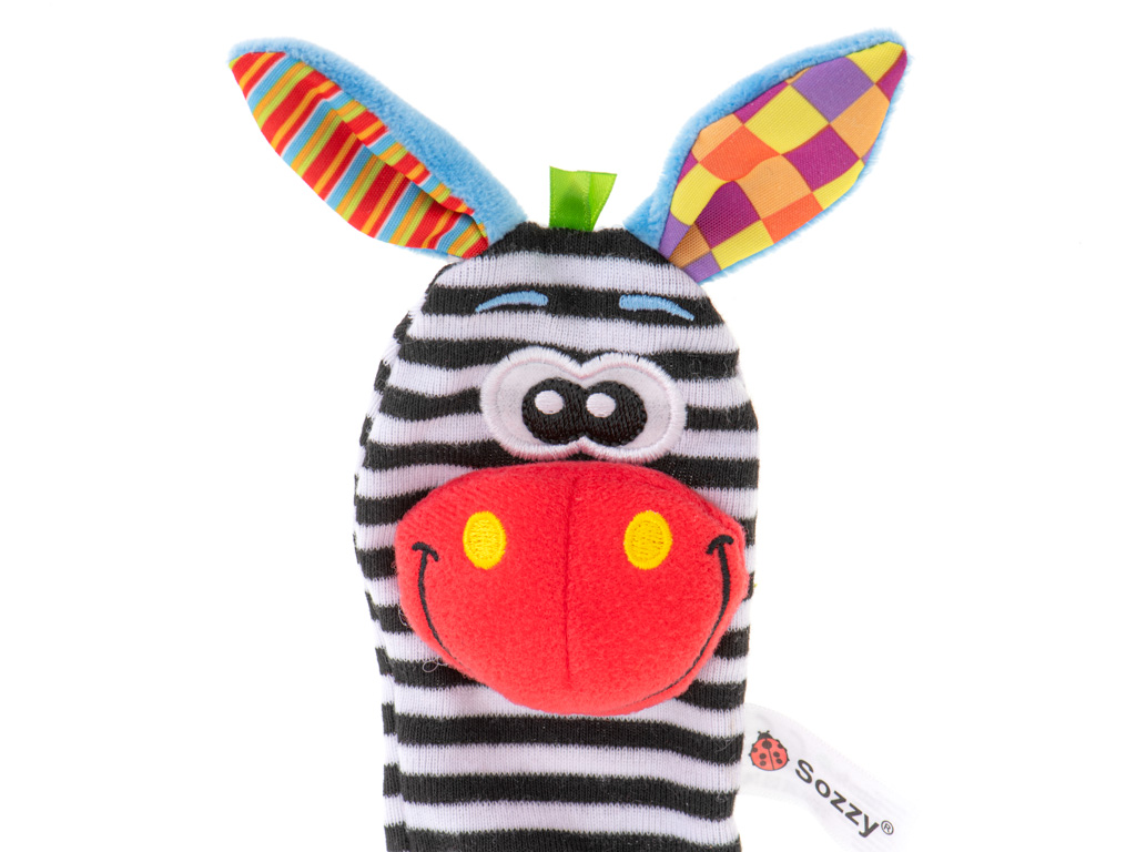 Skarpetki zapewniające odpowiednią temperaturę, dodatkowo dźwięk wydawany przez grzechotkę intryguje Maluszka, pobudzając do unoszenia nóg i uczący zasady „przyczyna- skutek”.