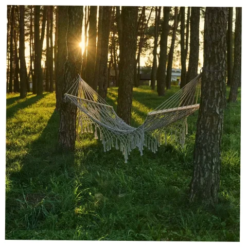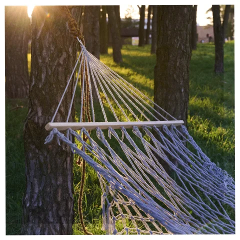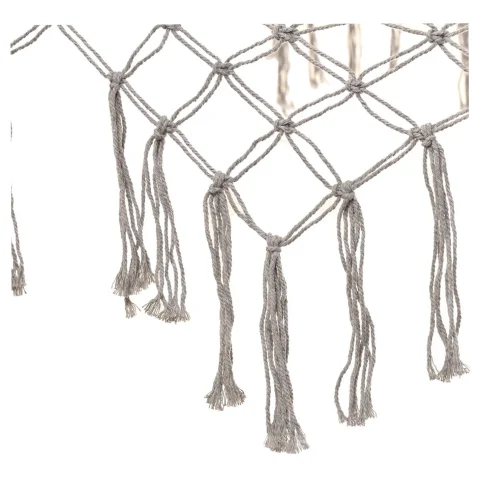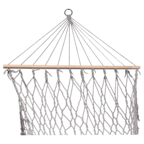 Hamak boho z frędzlami w kolorze szarym z drewnianymi drążkami (100 cm) i powierzchnią leżenia 200×100 cm. Całkowita długość 280 cm. Udźwig 150 kg. Materiał: 65% bawełna, 35% poliester. Frędzle 27 cm