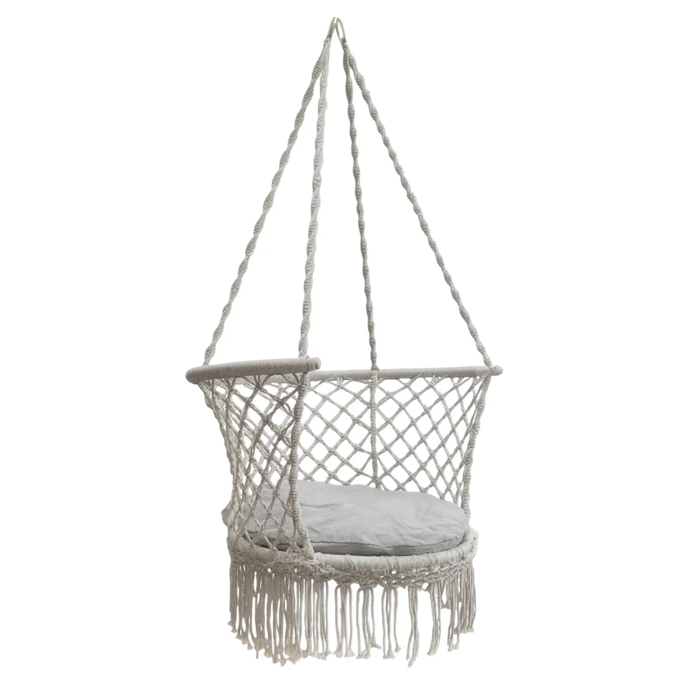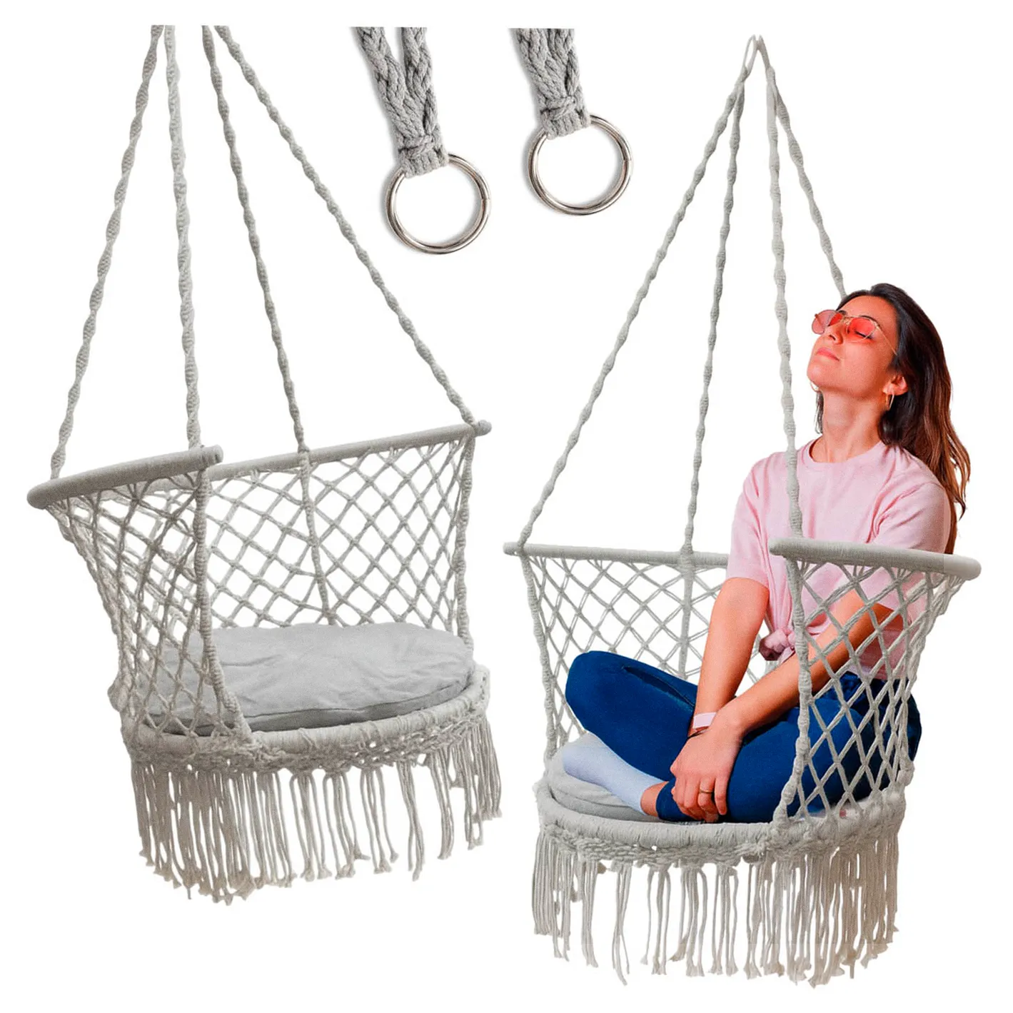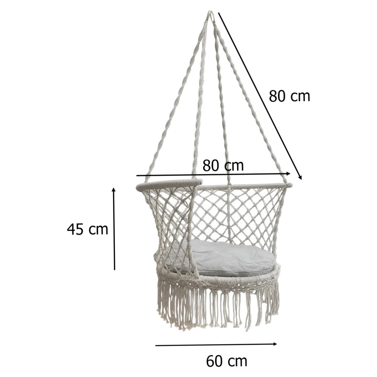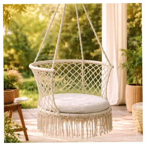 Na huśtawce można siedzieć prosto lub po turecku – zbalansowana budowa minimalizuje ryzyko upadku. Klasyczna kolorystyka w połączeniu z designem w klimacie boho świetnie pasuje do nowoczesnych oraz rustykalnych aranżacji.