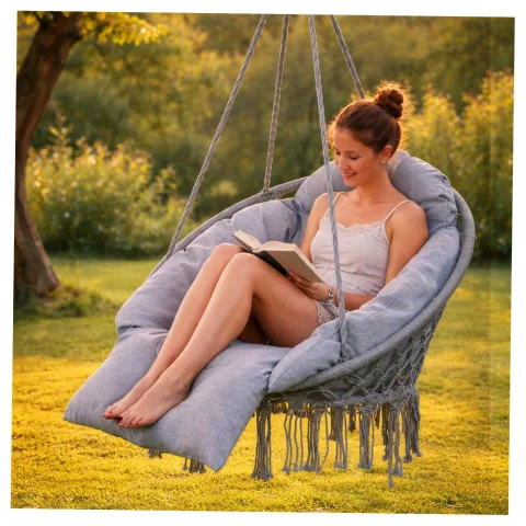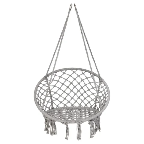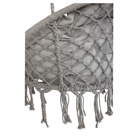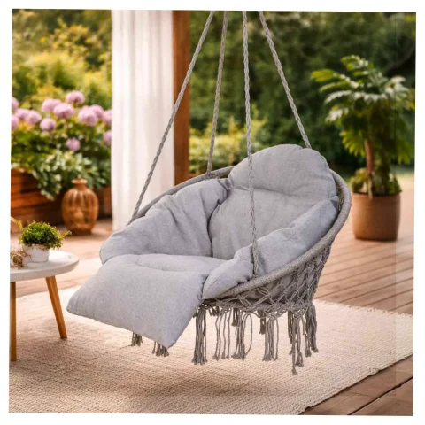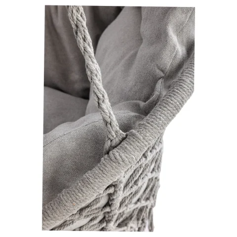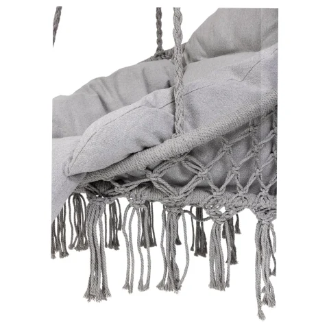 Huśtawka bocianie gniazdo z poduszką XXL. Idealna na balkon lub do altanki. Wykonana z wytrzymałej bawełny. Maksymalne obciążenie: 150 kg. Kolor: szary. Średnica całkowita: 80 cm.