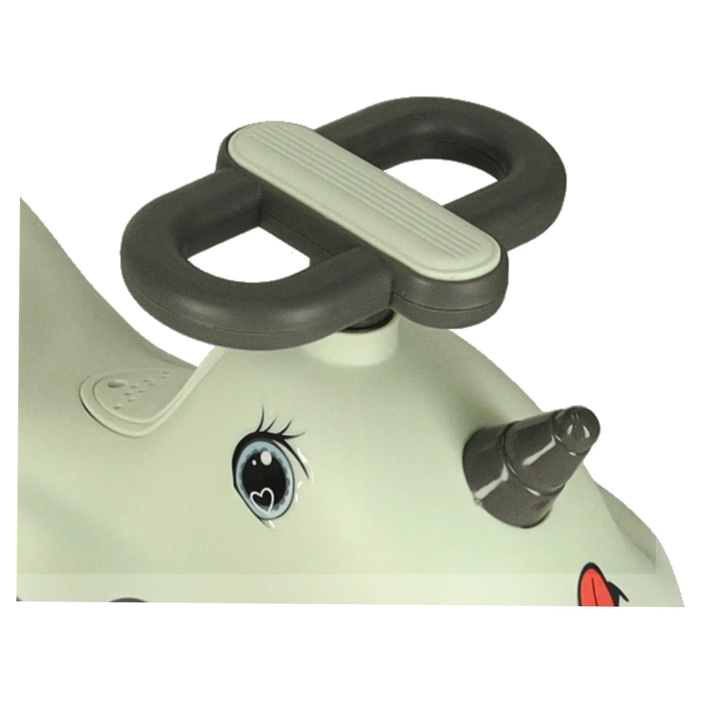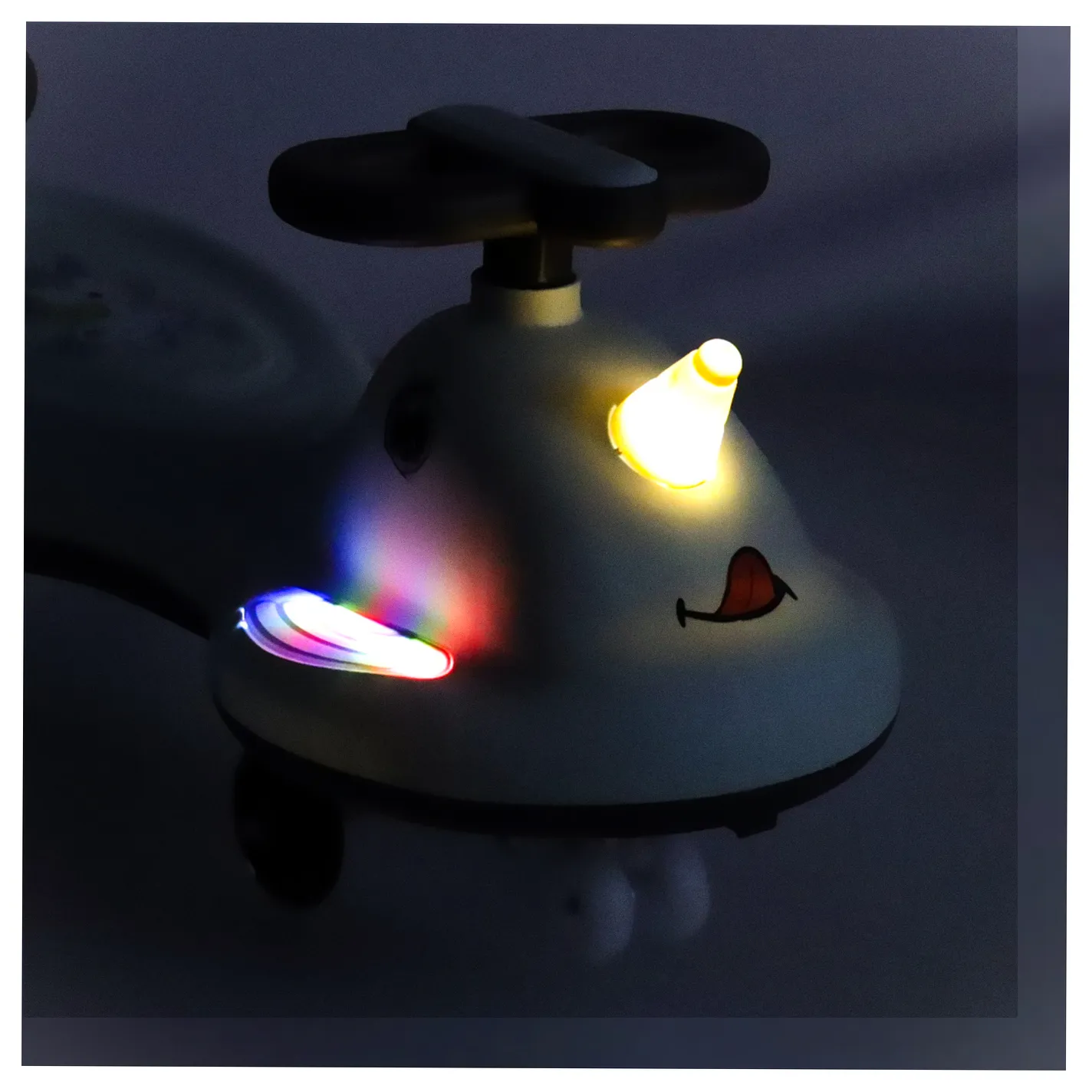 Jeździk grawitacyjny dla dzieci od 3 lat, wykonany z wytrzymałego tworzywa, wyposażony w kółka LED, podświetlany róg i podnóżki. Stabilna konstrukcja, nisko osadzone siedzisko, maks. obciążenie 65 kg. Do użytku wewnątrz i na zewnątrz.