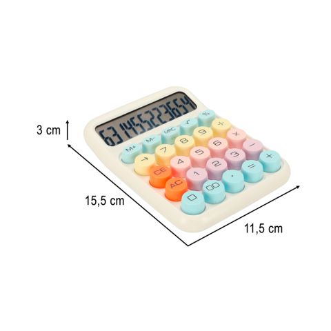 Wymiary kalkulatora: 15,5 cm x 11,5 cm x 3 cm. Wymiary opakowania: 18 cm x 11,5 cm x 11,5 cm.
