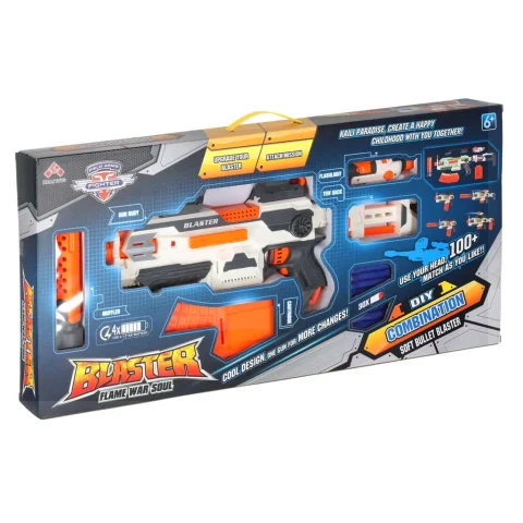 Fantastyczny karabin Blaster Modular 4w1. Idealny dla fanów wyrzutni NERF. Posiada szyny, do których można doczepić dodatkowe części z zestawu. Wyposażony w prawdziwą latarkę. W zestawie akumulator 500mAh, 4,8V. Wymiary karabinu: 38,5x22x6,5cm.