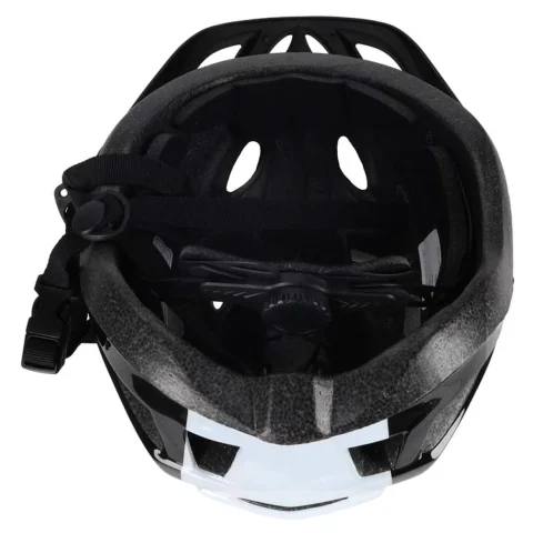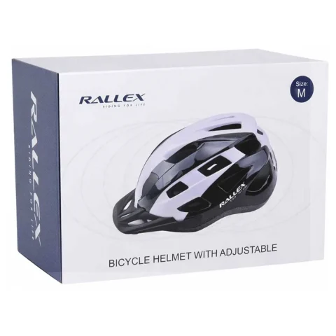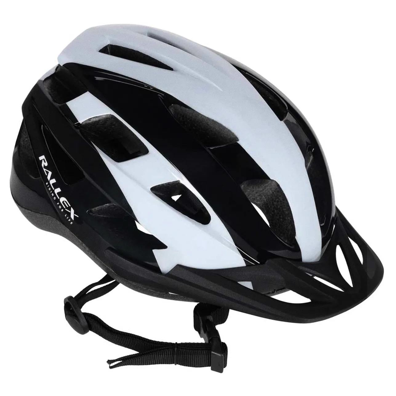 Kask RALLEX M 54-58 cm (270 g), biało-czarny. Materiał EPS + powłoka PVC, technologia Out-Mould. 21 otworów wentylacyjnych, zintegrowany daszek. System Head Lock regulowany pokrętłem, wyjmowana wyściółka i regulowany pasek.