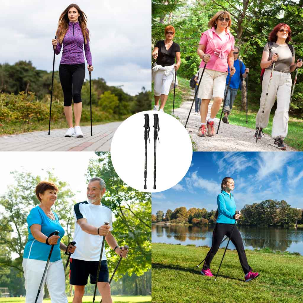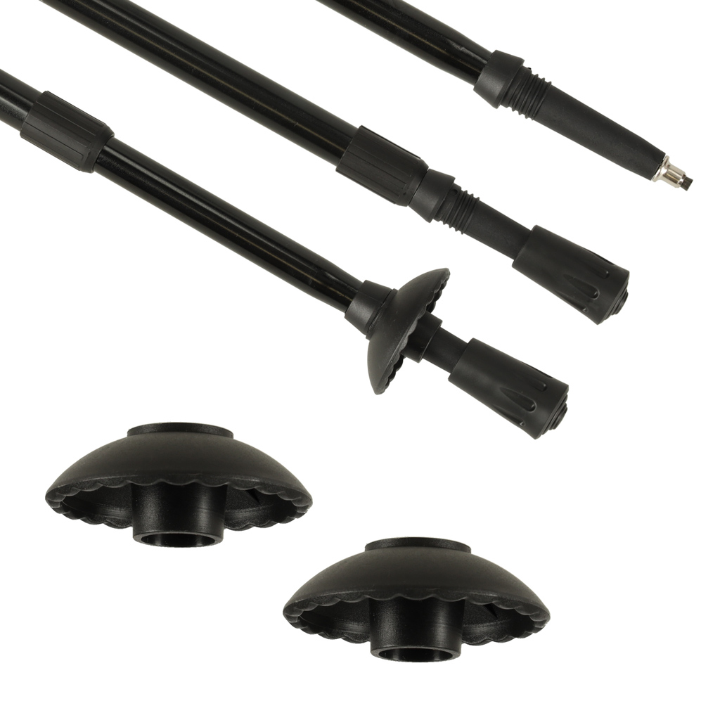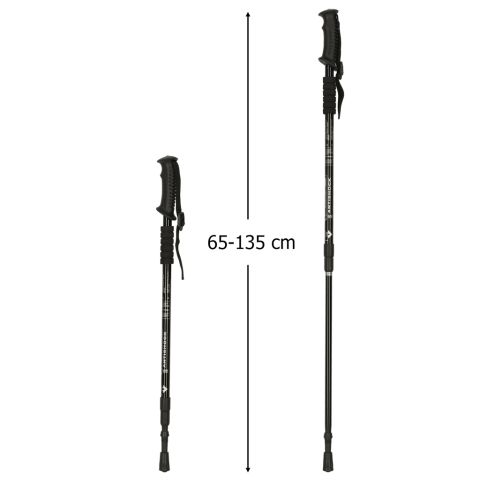 Kije trekkingowe do nordic walking, aluminiowe, z regulacją długości 65–135 cm i ergonomiczną rękojeścią. Wielosegmentowa konstrukcja ułatwia transport. Wymienne groty pozwalają dostosować kijki do asfaltu, śniegu, piasku i leśnych tras.