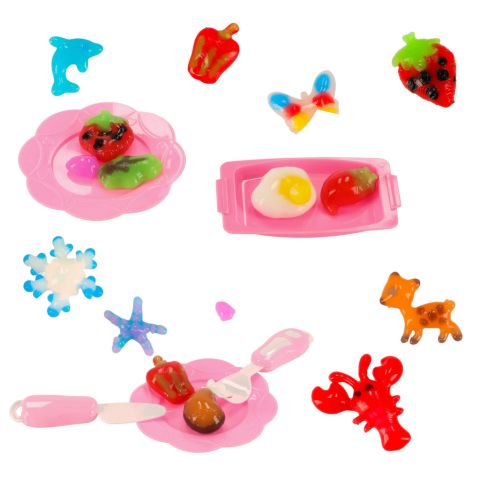 - Pobudza wyobraźnię dzieci – zestaw kreatywny z kolorowymi żelami i foremkami wspiera umiejętności plastyczne dzieci oraz wpływa korzystnie na ich integrację sensoryczną