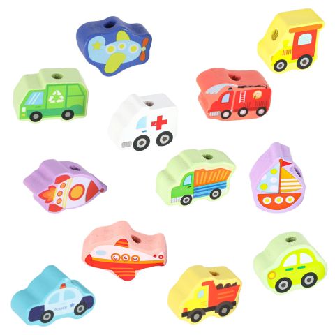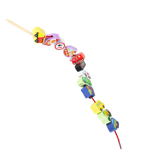 Zestaw 23 klocków drewnianych do nawlekania: pojazdy i znaki drogowe + 2 sznurki z nawlekaczami. Wykonane z naturalnego drewna, malowane bezpiecznymi ekologicznymi farbami. Ćwiczą małą motorykę, koordynację ręka-oko i precyzję ruchów. Dla dzieci 3+.