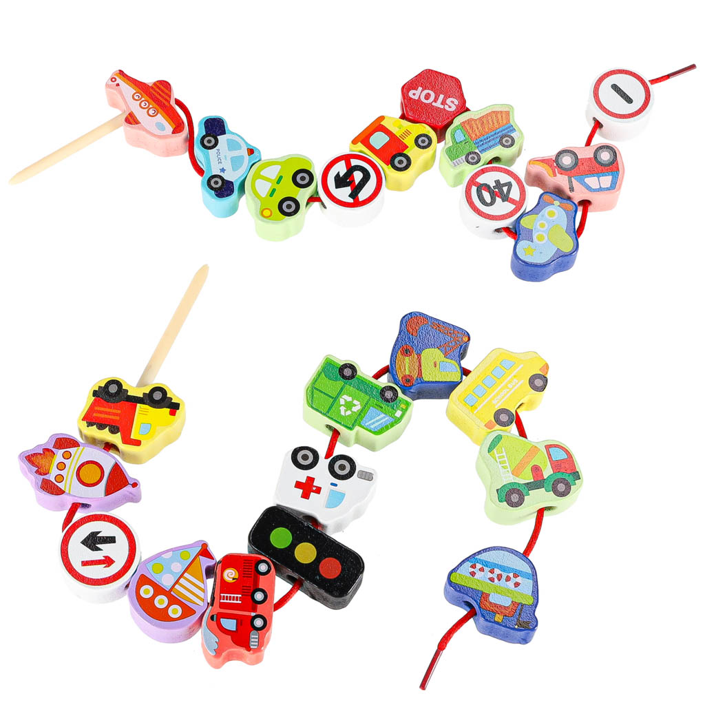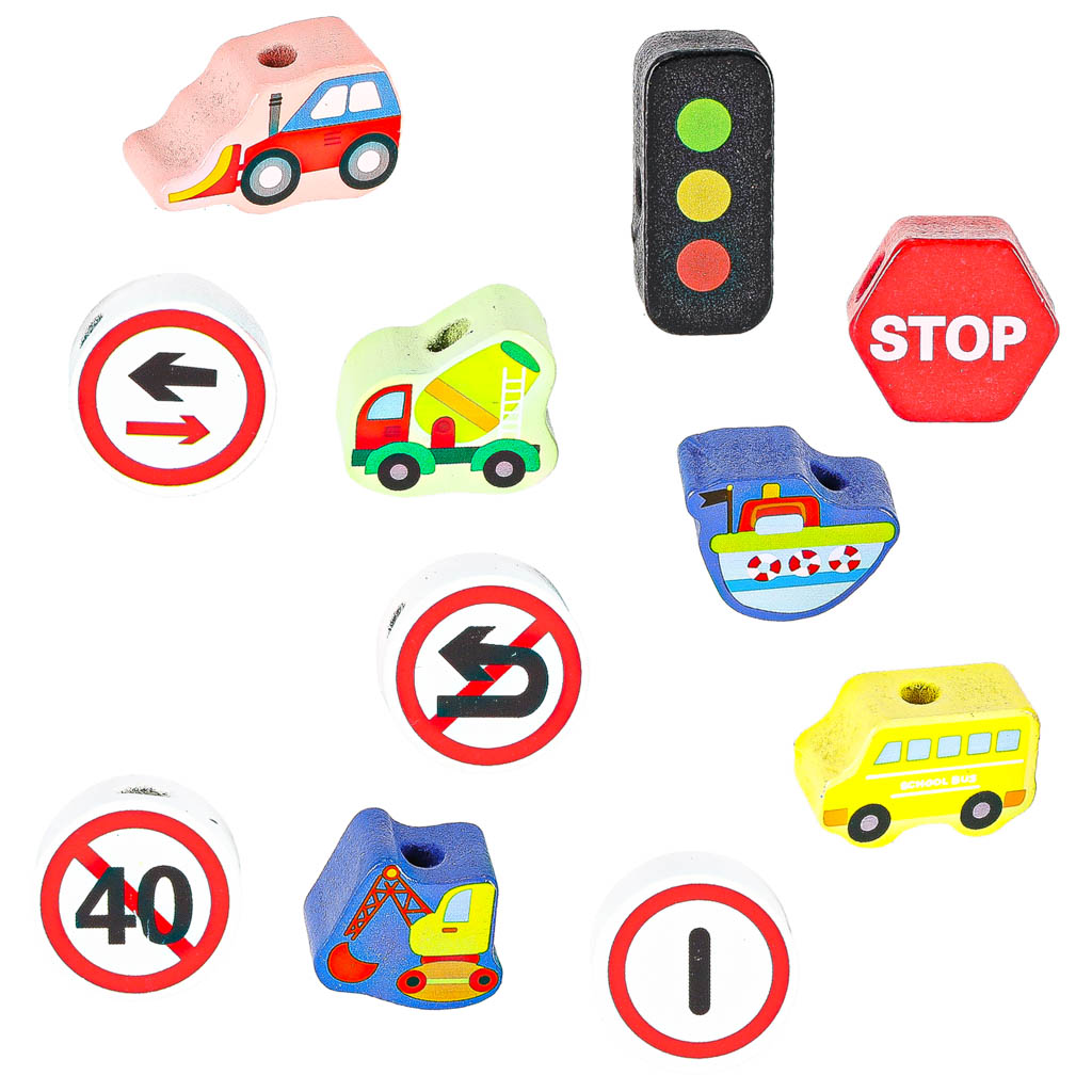 KLOCKI DREWNIANE DO NAWLEKANIA – POJAZDY ZNAKI DROGOWE + DWA SZNURKI Z NAWLEKACZAMI