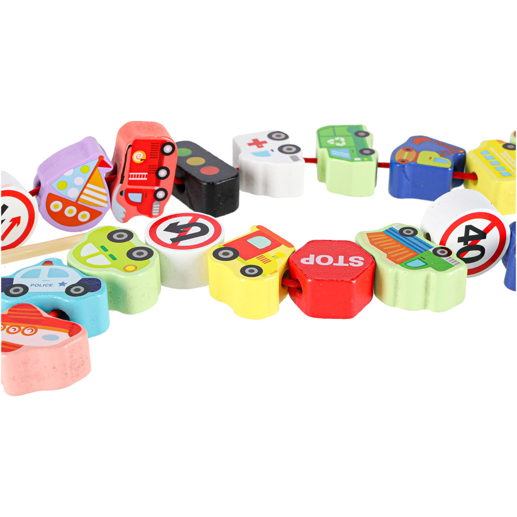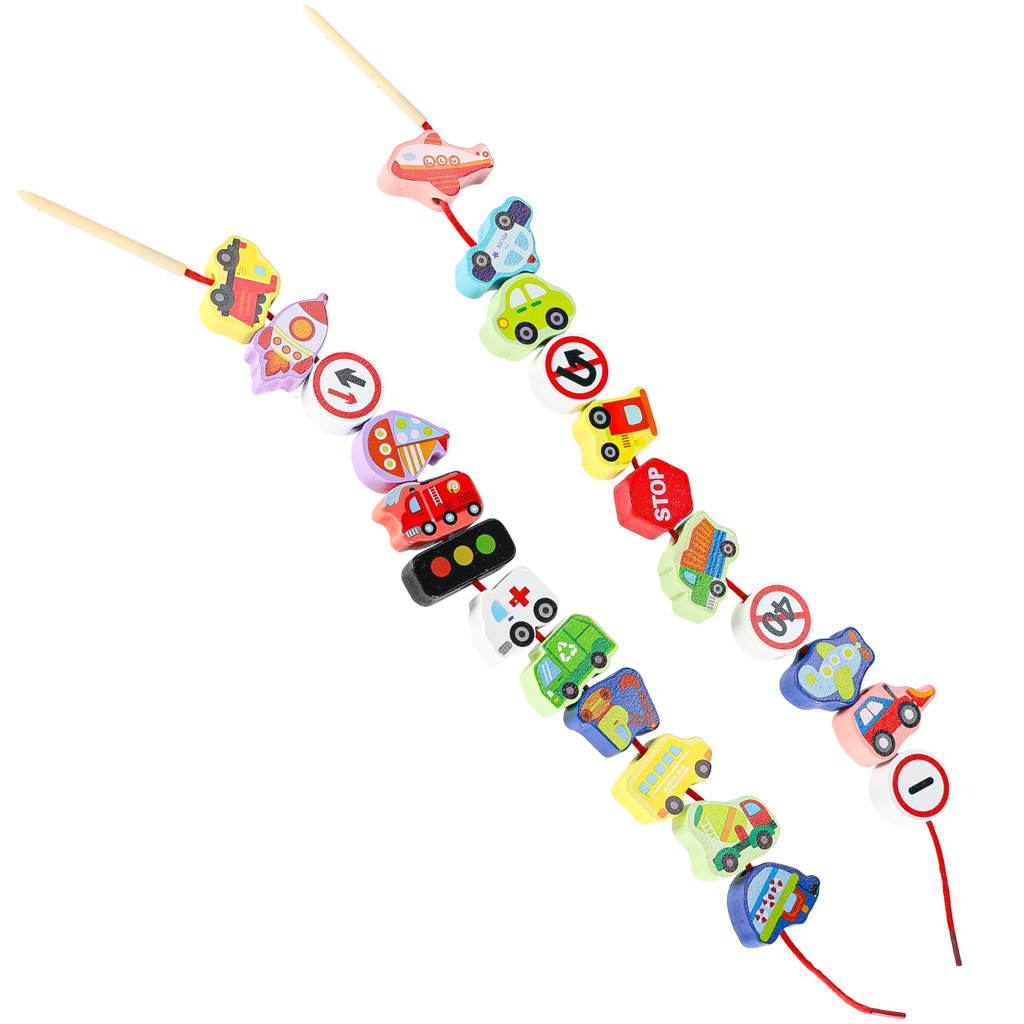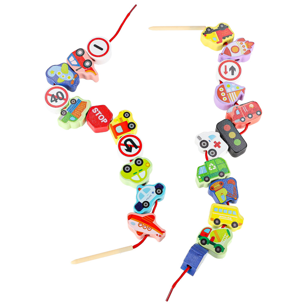 Zestaw 23 klocków drewnianych do nawlekania: pojazdy i znaki drogowe + 2 sznurki z nawlekaczami. Wykonane z naturalnego drewna, malowane bezpiecznymi ekologicznymi farbami. Ćwiczą małą motorykę, koordynację ręka-oko i precyzję ruchów. Dla dzieci 3+.