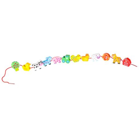 Drewniane klocki edukacyjne zwierzątka – wykonane z naturalnego drewna lipowego. Zestaw zawiera 12 elementów i sznurek do nawlekania. Przeznaczone dla dzieci 3+, wspierają rozwój motoryki małej, koordynację ręka-oko oraz naukę kształtów i kolorów.