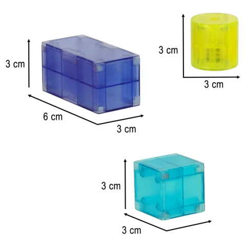 - Wymiary największego klocka: 6 cm x 3 cm x 3 cm