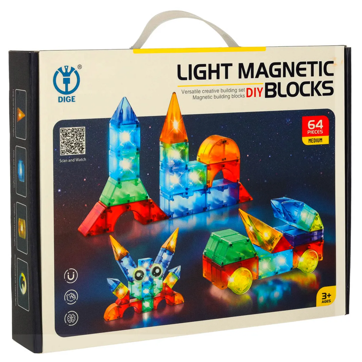 Klocki w różnych kształtach i kolorach dają dziecku możliwość tworzenia wielu konstrukcji – od prostych wież po bardziej skomplikowane figury 3D. Dzięki wbudowanym magnesom budowanie z klocków jest łatwe i przyjemne. Świecące elementy sprawiają, że każda konstrukcja wygląda imponująco, szczególnie w ciemności.