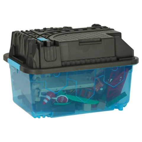 Zestaw jest zapakowany w solidne plastikowe pudełko, które pełni również funkcję elementu toru. Po skończonej zabawie pudełko pozwala na przechowywanie wszystkich elementów w jednym miejscu, co ułatwia organizację i oszczędza miejsce w pokoju dziecka.
