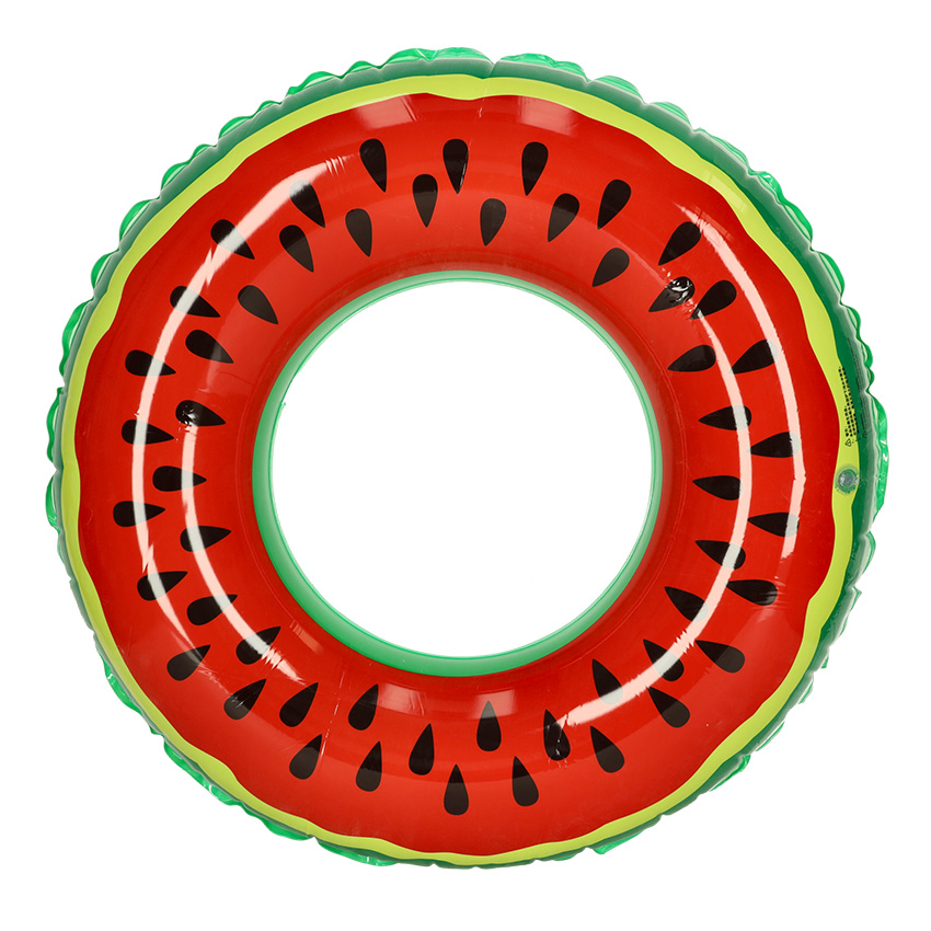 Kolorowe koło dmuchane w kształcie arbuza, wykonane z wysokiej jakości plastiku PCV, gwarantującego wytrzymałość.