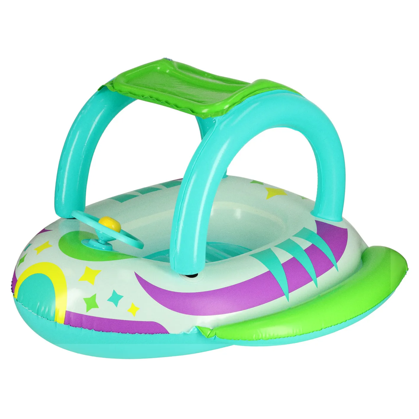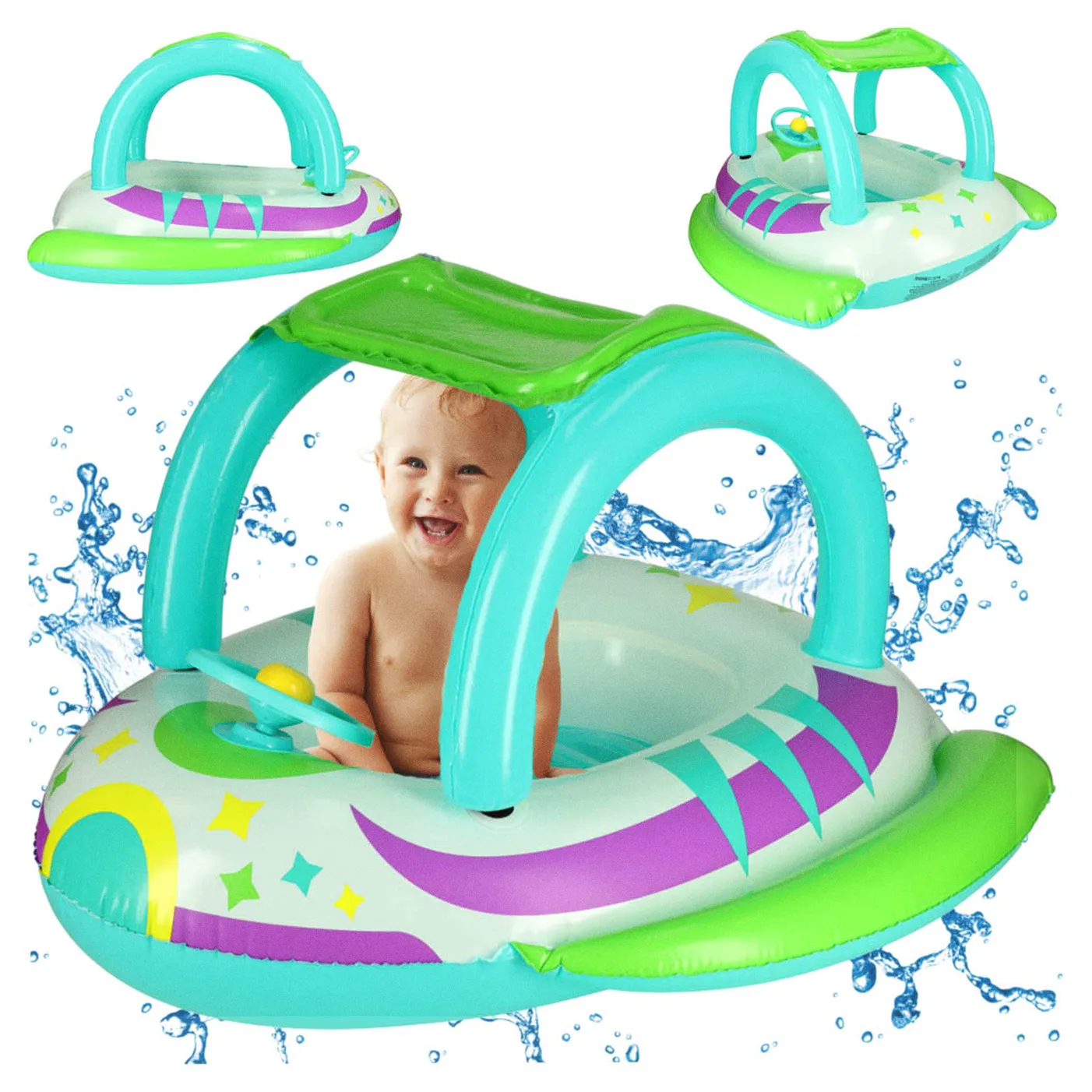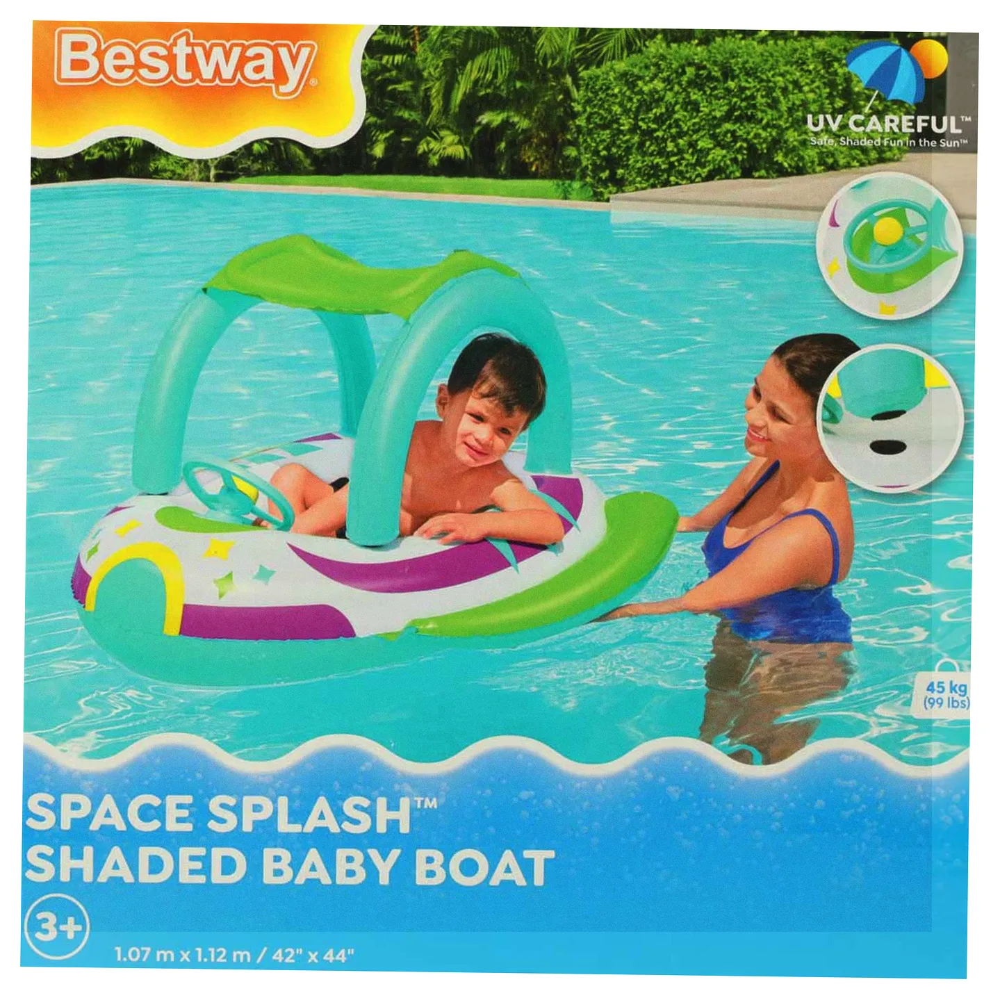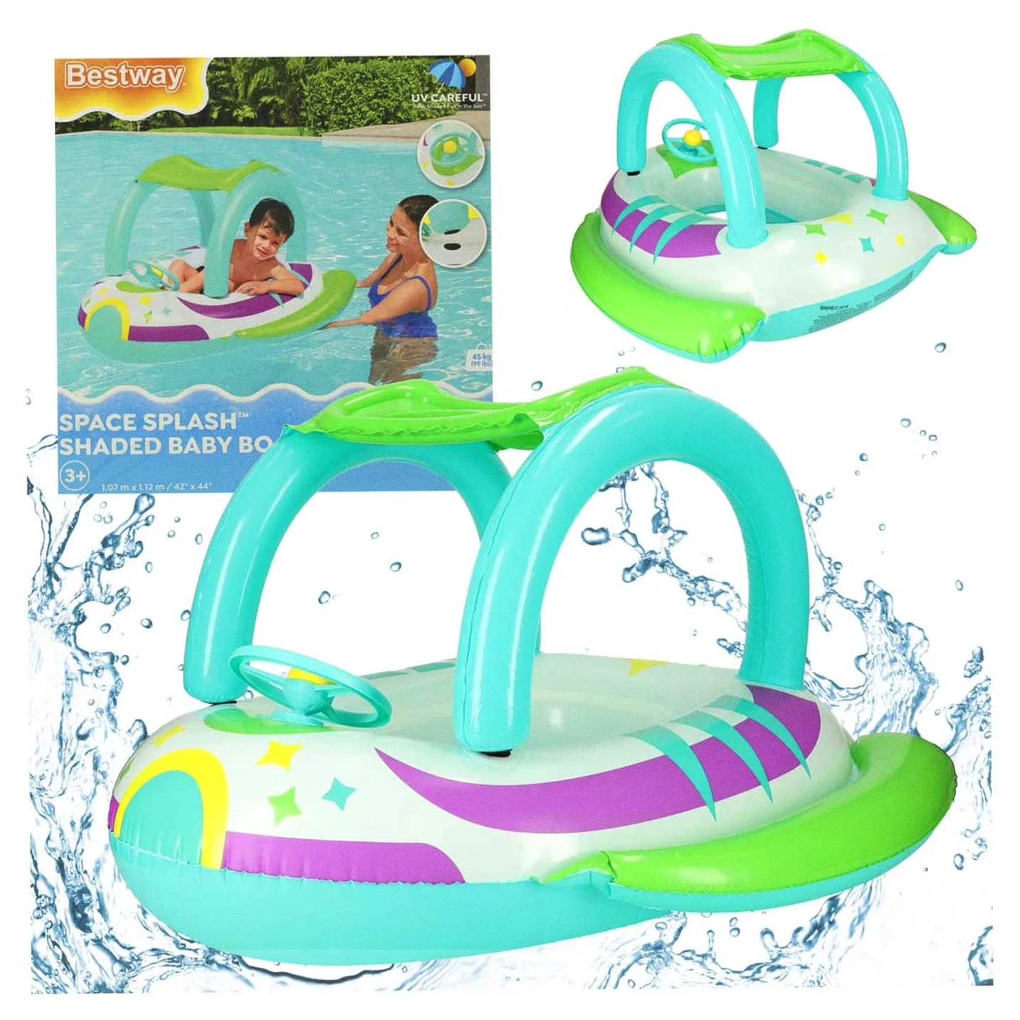 - ochrona przed słońcem – praktyczny daszek zapewnia dziecku cień i ochronę przed szkodliwymi promieniami słonecznymi, pozwalając na dłuższe beztroskie szaleństwa w wodzie