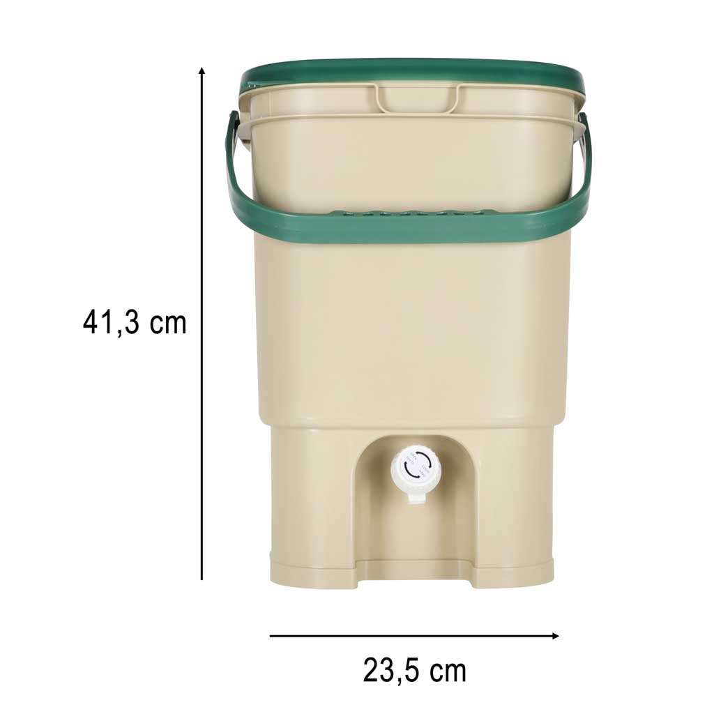 Kompostownik kuchenny 15L do zbierania bioodpadów i odpadów organicznych. Wyposażony w pokrywę, tackę ociekową oraz kran do odprowadzania płynu. W zestawie pojemnik na płyn i akcesoria do obsługi. Idealny do segregacji.