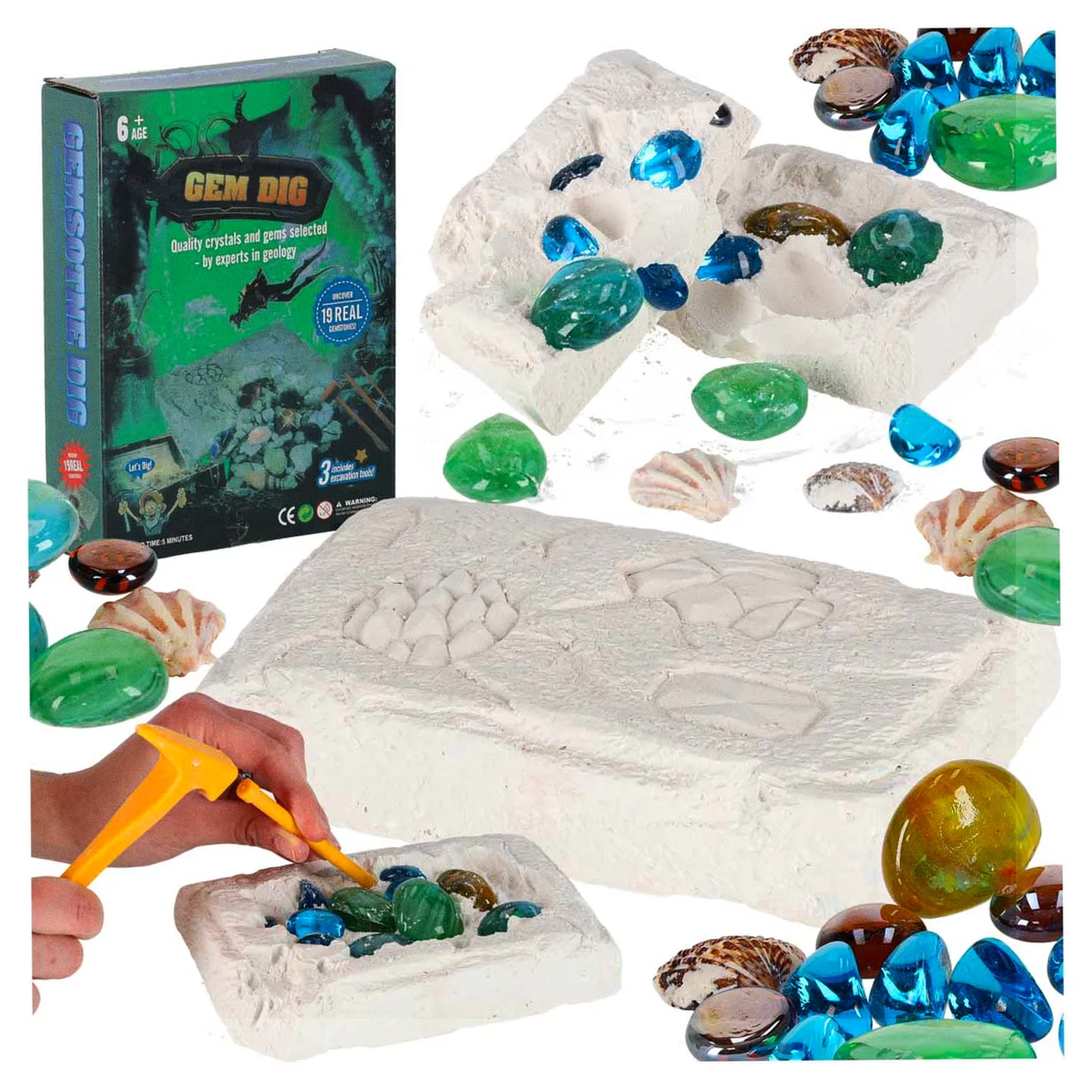 Zestaw wykopalisk kamieni i diamentów to edukacyjny zestaw STEM z realistycznym blokiem gipsowym, narzędziami (młotek, dłuto, pędzelek) i ukrytymi kamieniami. Uczy metod archeologicznych, rozwija zdolności manualne i precyzję podczas symulacji wykopalisk.