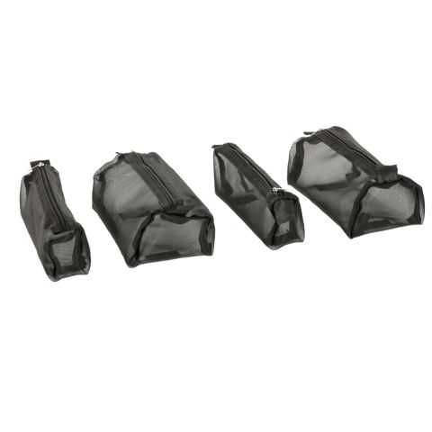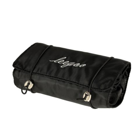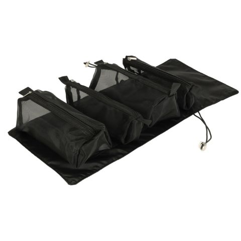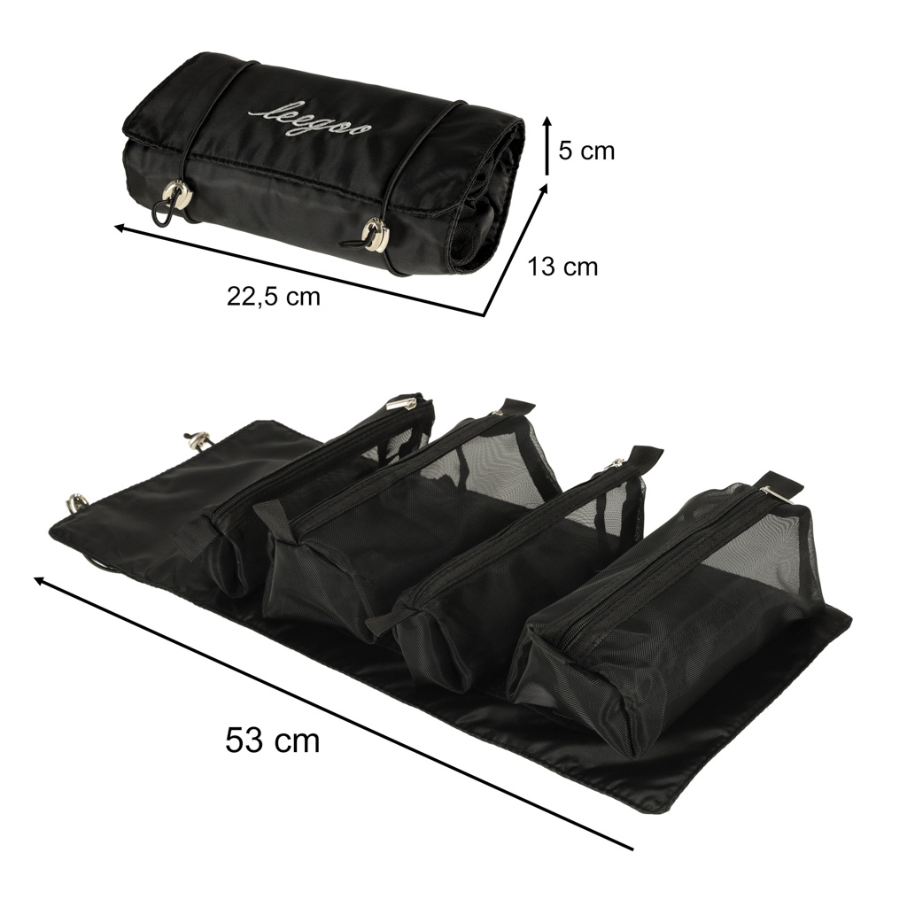 Czarna kosmetyczka podróżna – można ją zwinąć w rulon, dzięki czemu zajmie mniej miejsca w bagażu. Posiada cztery przegrody, które można wypiąć. Ścianki przegrody są wykonane z siatki, co ułatwia znalezienie produktów, a także zapewnia dobrą wentylację wilgotnych opakowań.