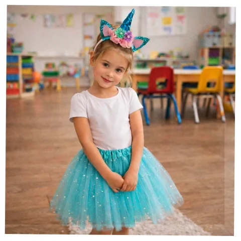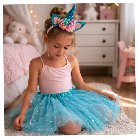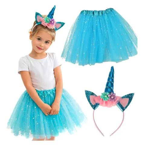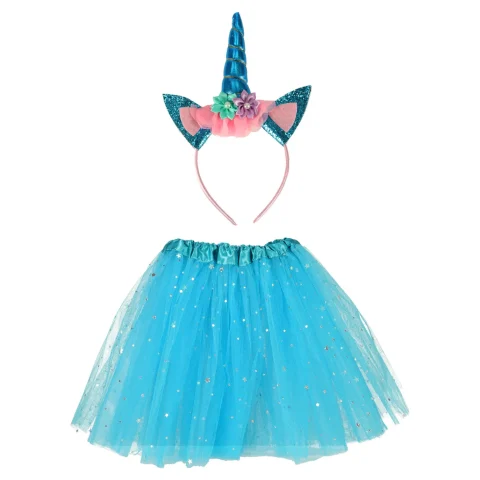 Strój karnawałowy opaska jednorożca i niebieska spódniczka księżniczki pokryta błyszczącymi gwiazdkami.