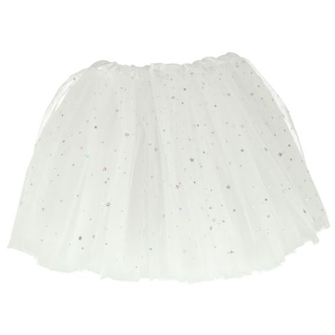 Strój karnawałowy opaska jednorożca i biała spódniczka księżniczki pokryta błyszczącymi gwiazdkami.