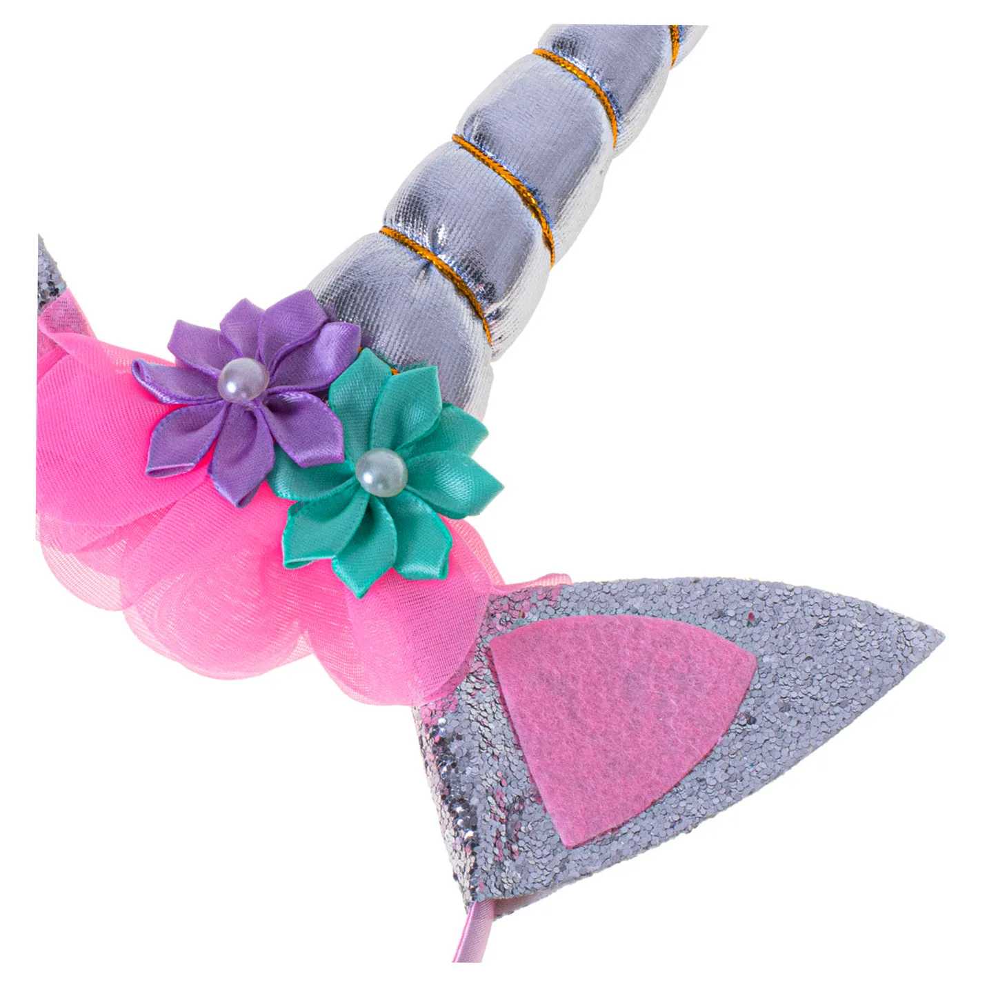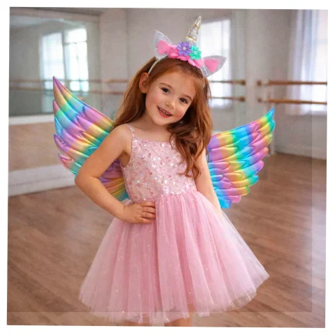W zestawie znajdziesz opaskę z cekinowymi uszami i charakterystycznym, pojedynczym rogiem, ale również tęczowe skrzydła. Twoje dziecko będzie mogło się przebrać za dobrze znane każdemu magiczne zwierzę – jednorożca!